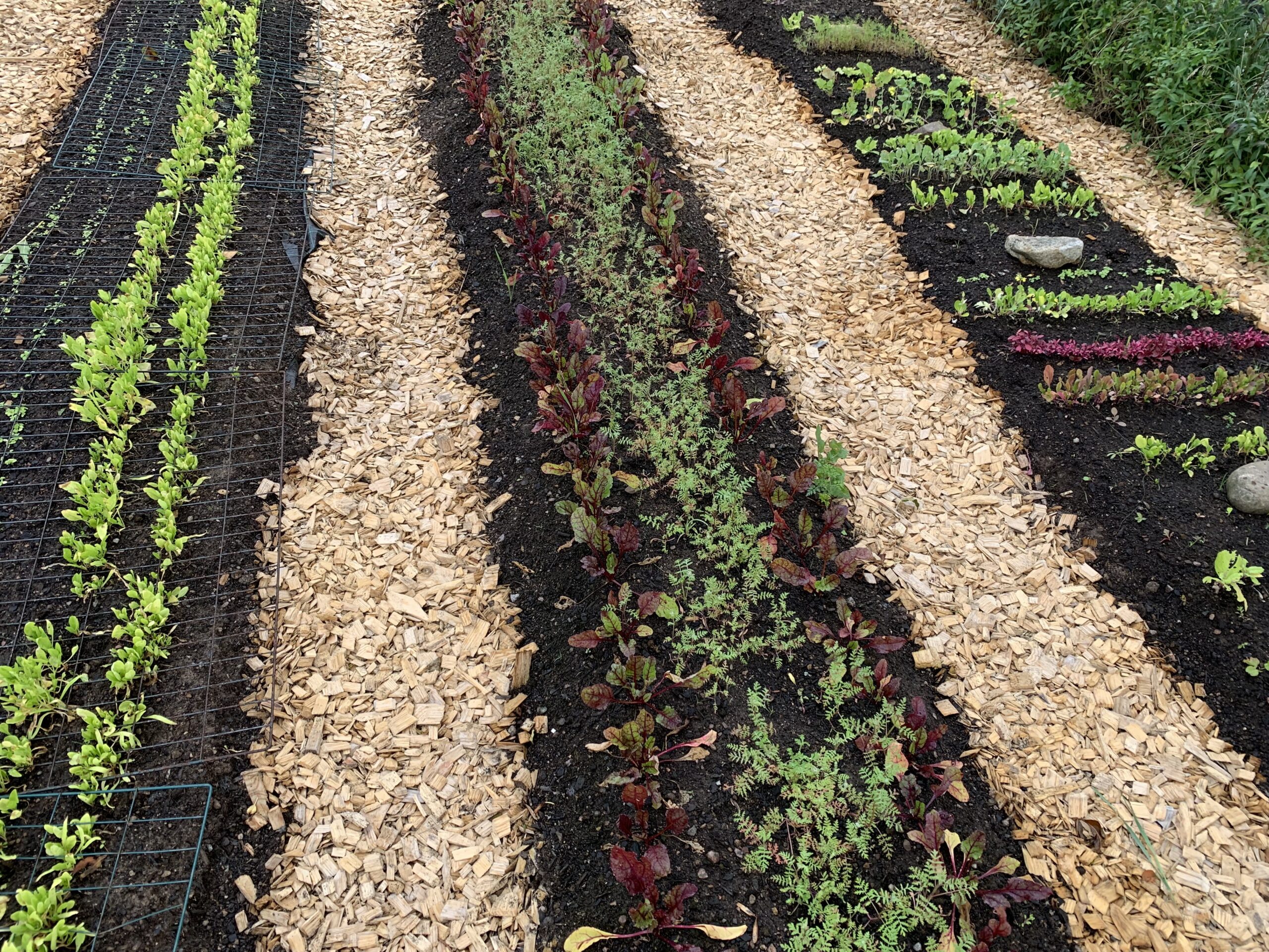 Tre odlingsbäddar med små grönsaker och träflis i gångarna