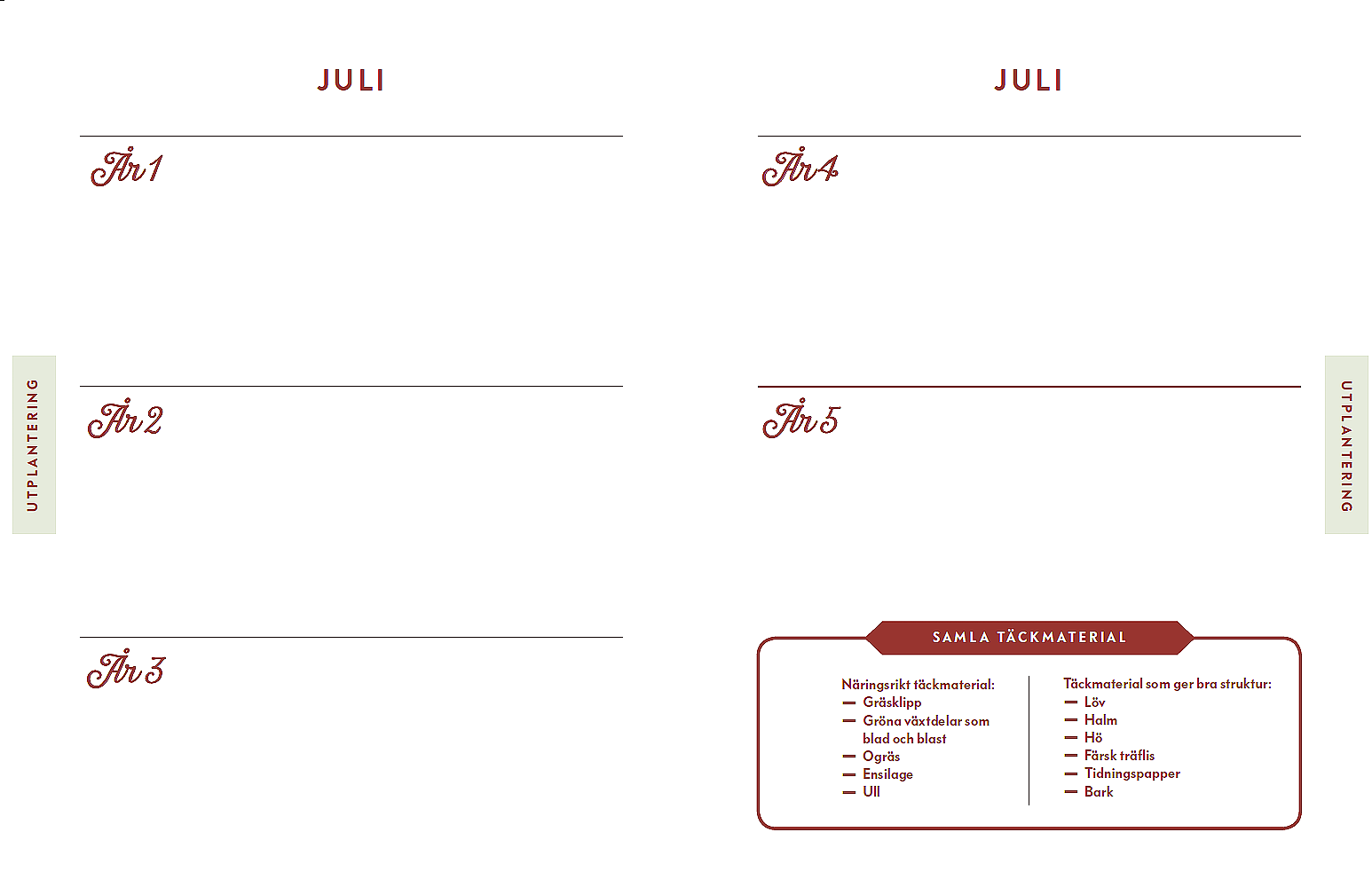 01. juli 2019Varje månad har flera uppslag med olika rubriker och plats för anteckningar år från år.