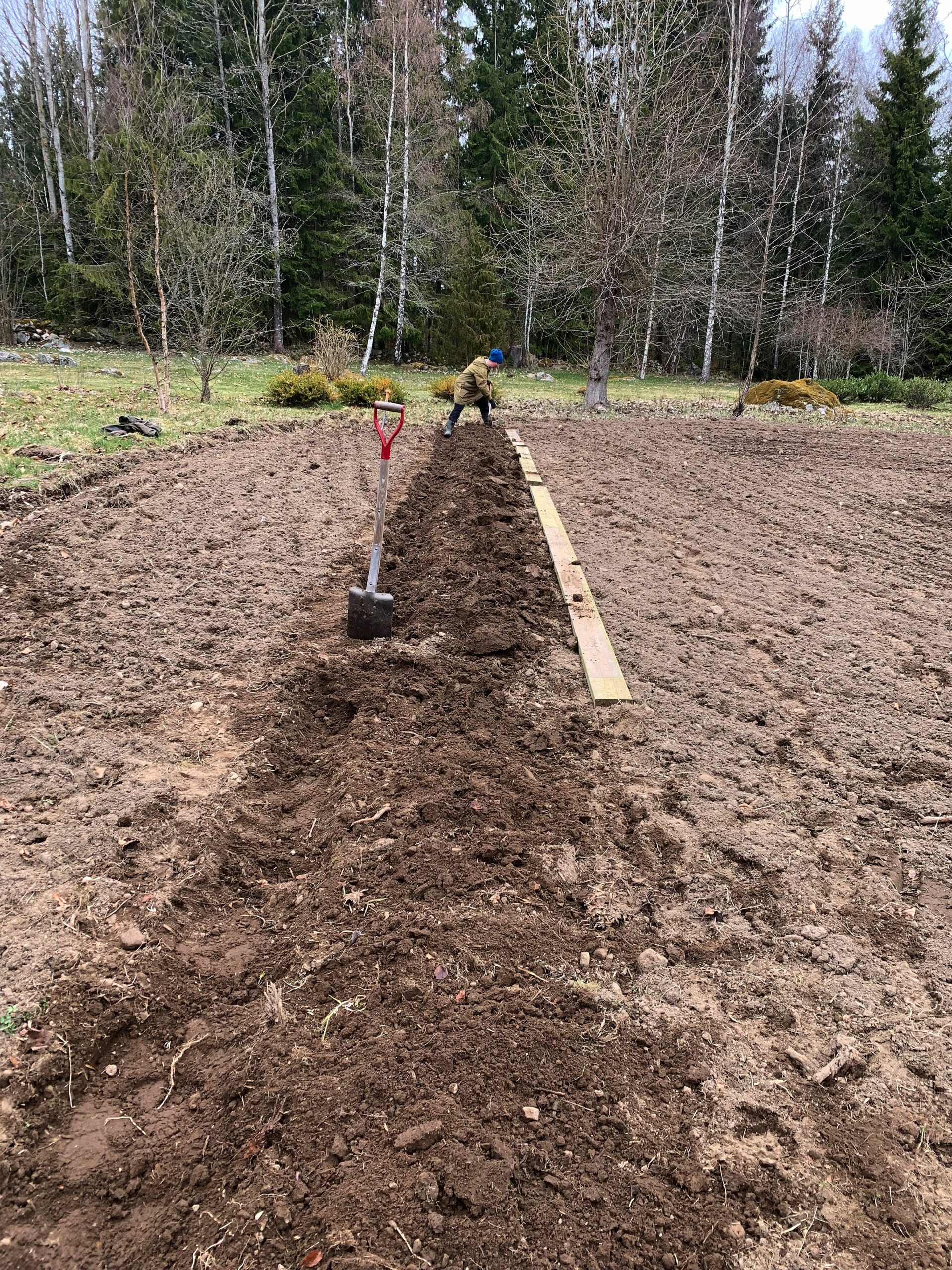 Jord från gångarna mellan nya bäddarna har lassats upp så att uppböjda bäddar skapats.
