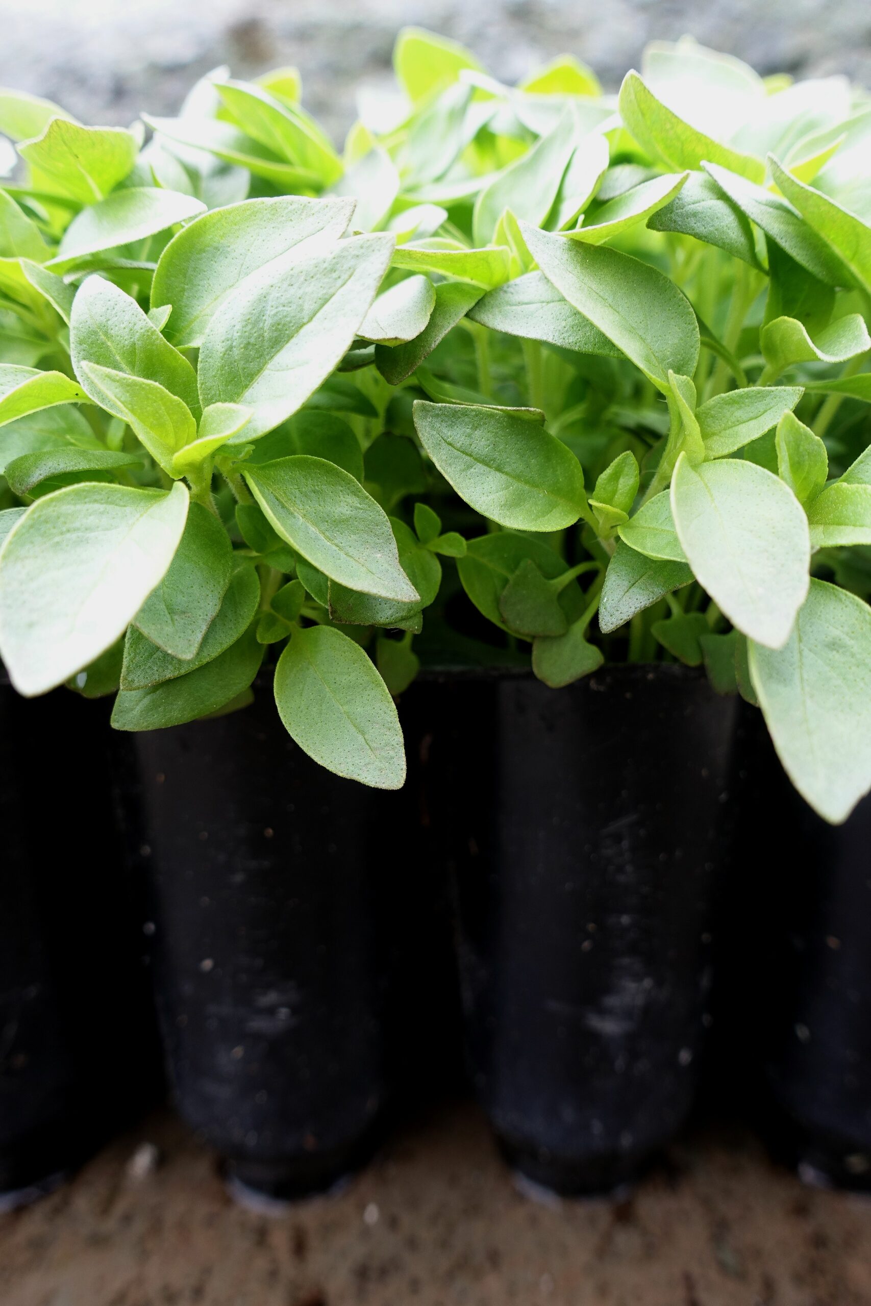 Frodiga basilikaplantor i pluggar.
