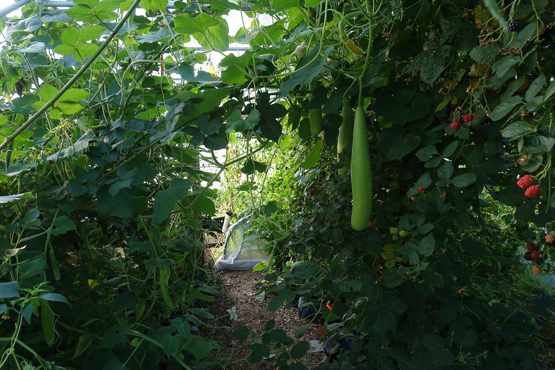 Inuti tunnelväxthuset är det frodigt och hänger björnbär och kalebass.