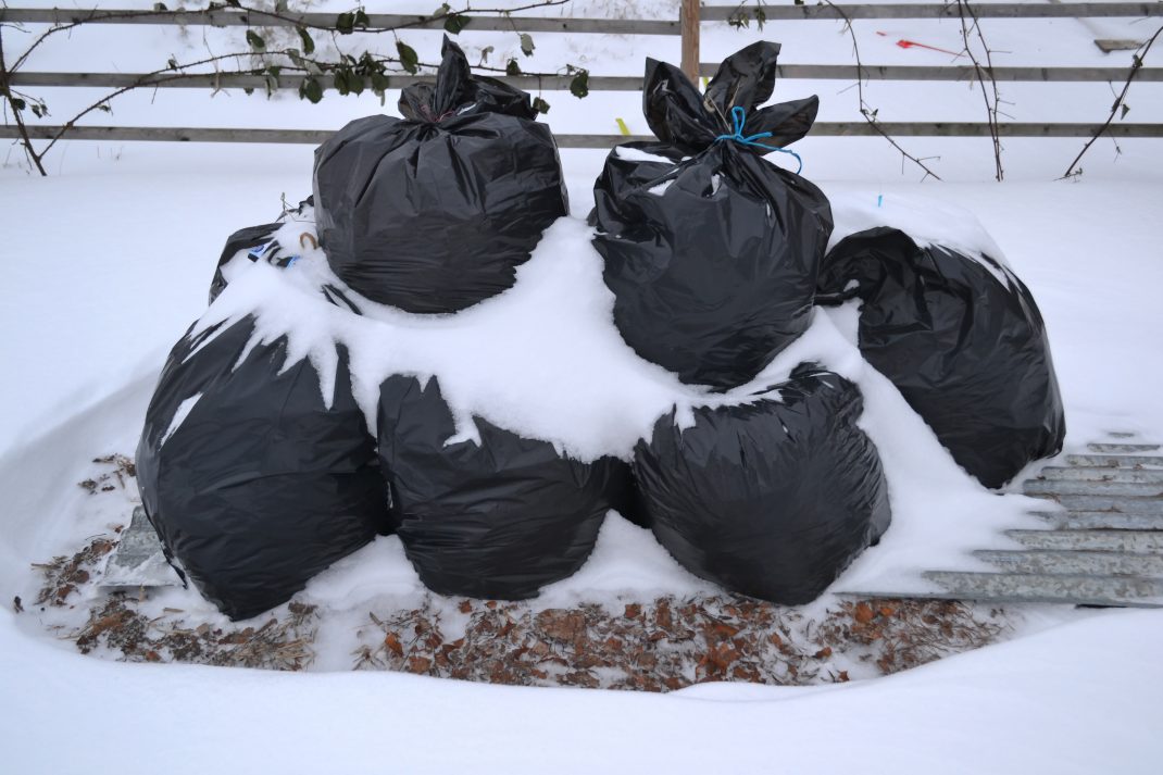 Sex fyllda, svarta sopsäckar står halvt täckta av snö ute i en vintrig köksträdgård.