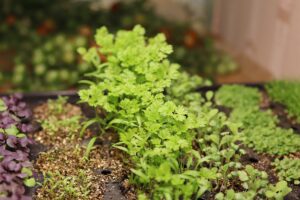 Detta är samma tråg som syns på föregående bild, närmast i bilden. På bara några dagar har både dansk körvel (mitten) och den lila basilikan vuxit massor.
