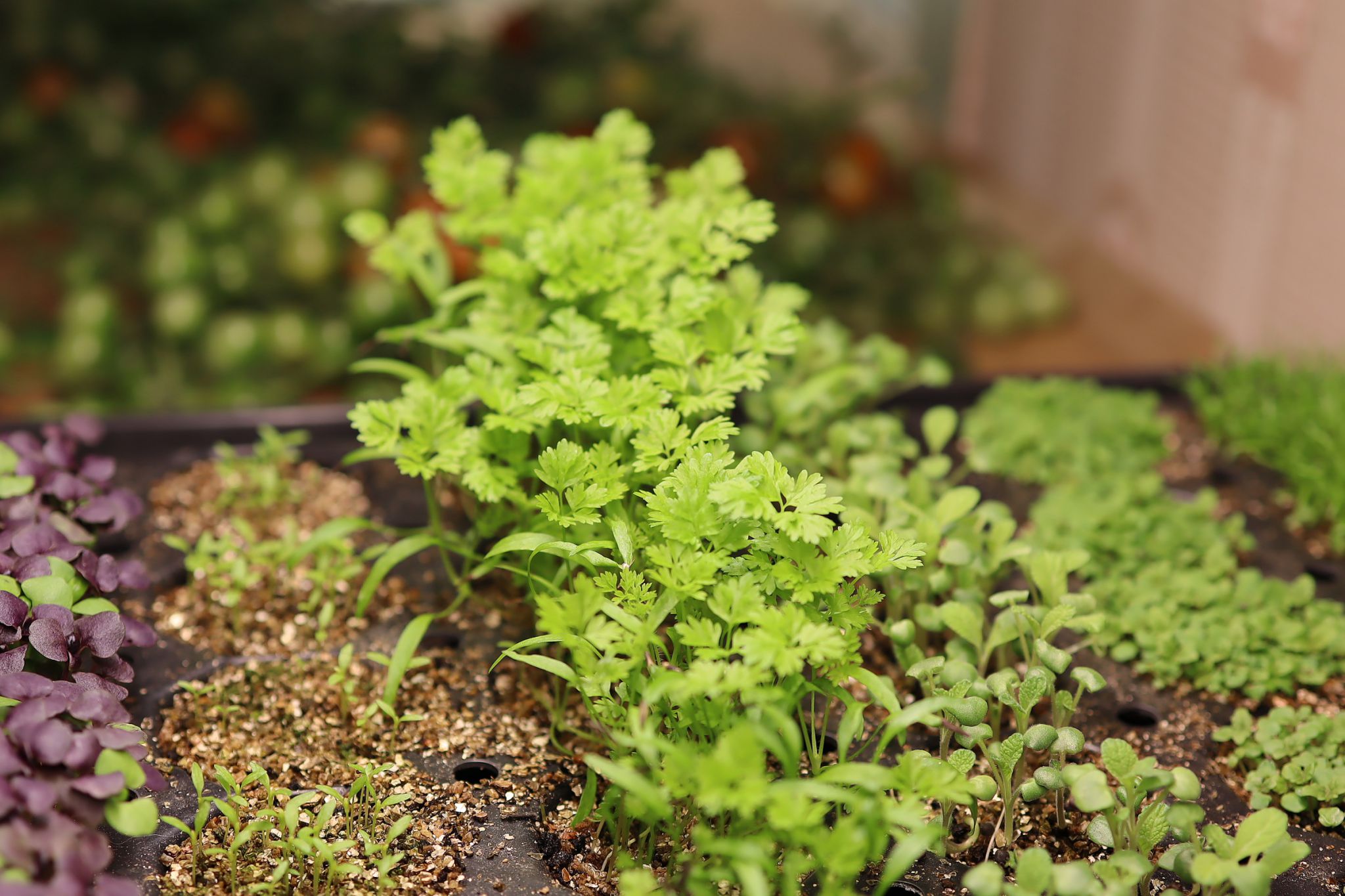 Detta är samma tråg som syns på föregående bild, närmast i bilden. På bara några dagar har både dansk körvel (mitten) och den lila basilikan vuxit massor.