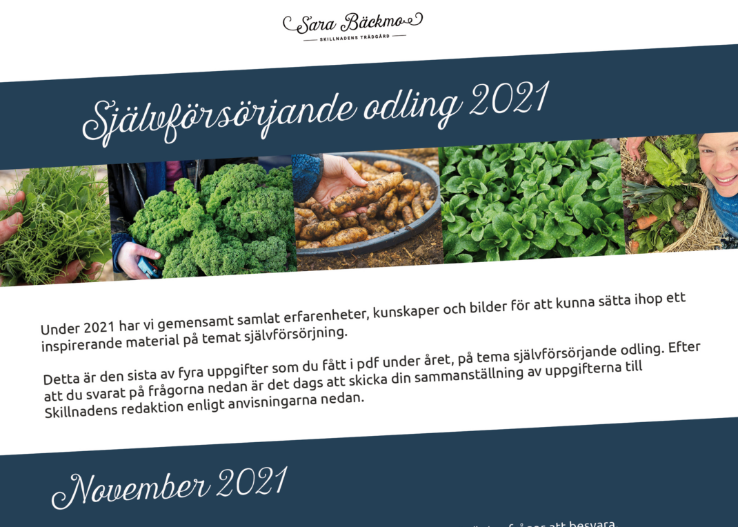 Under det här året har vi gjort några djupdyk i våra odlingar, på tema självförsörjning. Var och en samlar erfarenheter av att odla för att göra rejäl nytta i köket, efter egna förutsättningar och förmågor. Målet är att sammanfatta erfarenheter till något som kan inspirera odlare i olika delar av Sverige och som kan förankra begreppet självförsörjning på ett vidare sätt.