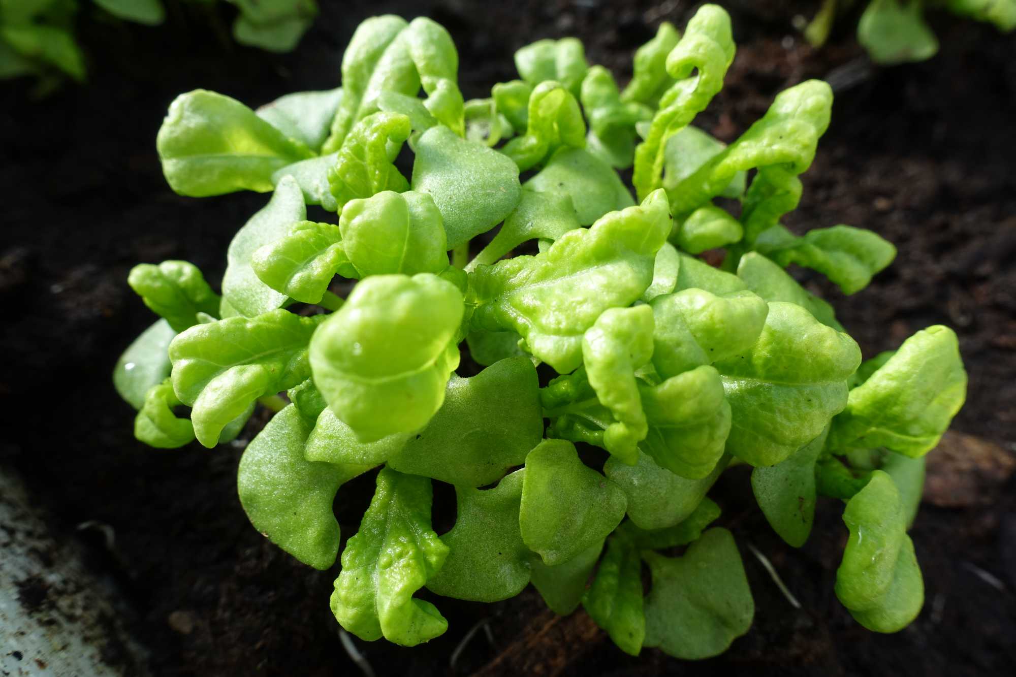 Jag är väldigt förtjust i de storbladiga sorterna av basilika som kallas för salladsbasilika. Det här är sorten 'Mammoth' som är på väg att växa till sig.