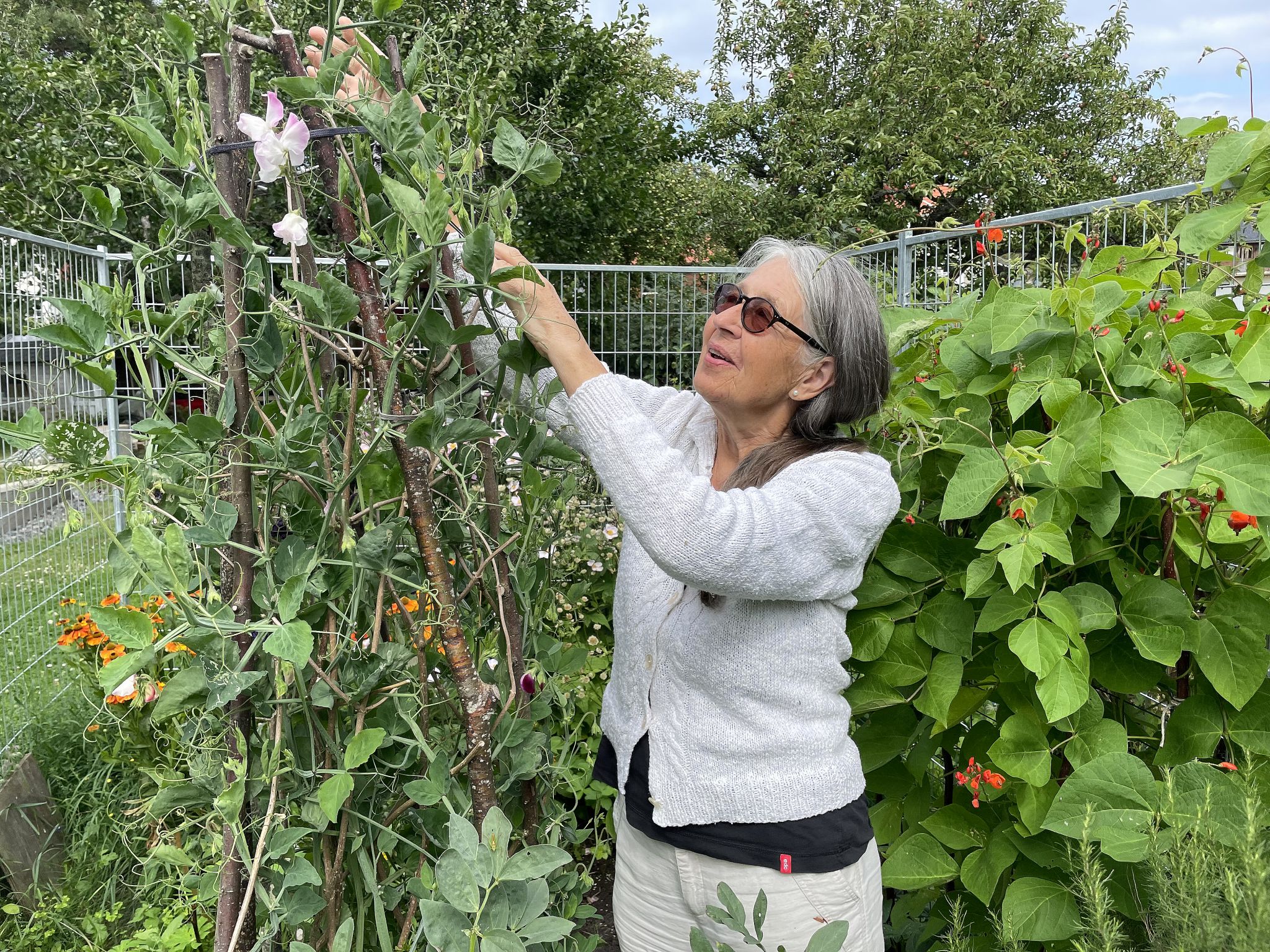 08. augusti 2021Min mamma Ulla Herlitz på Styrsö, fotograferad i sin hundgårds-trädgård som skyddar mot rådjur. Luktärtstornet har äntligen fått vara ifred!