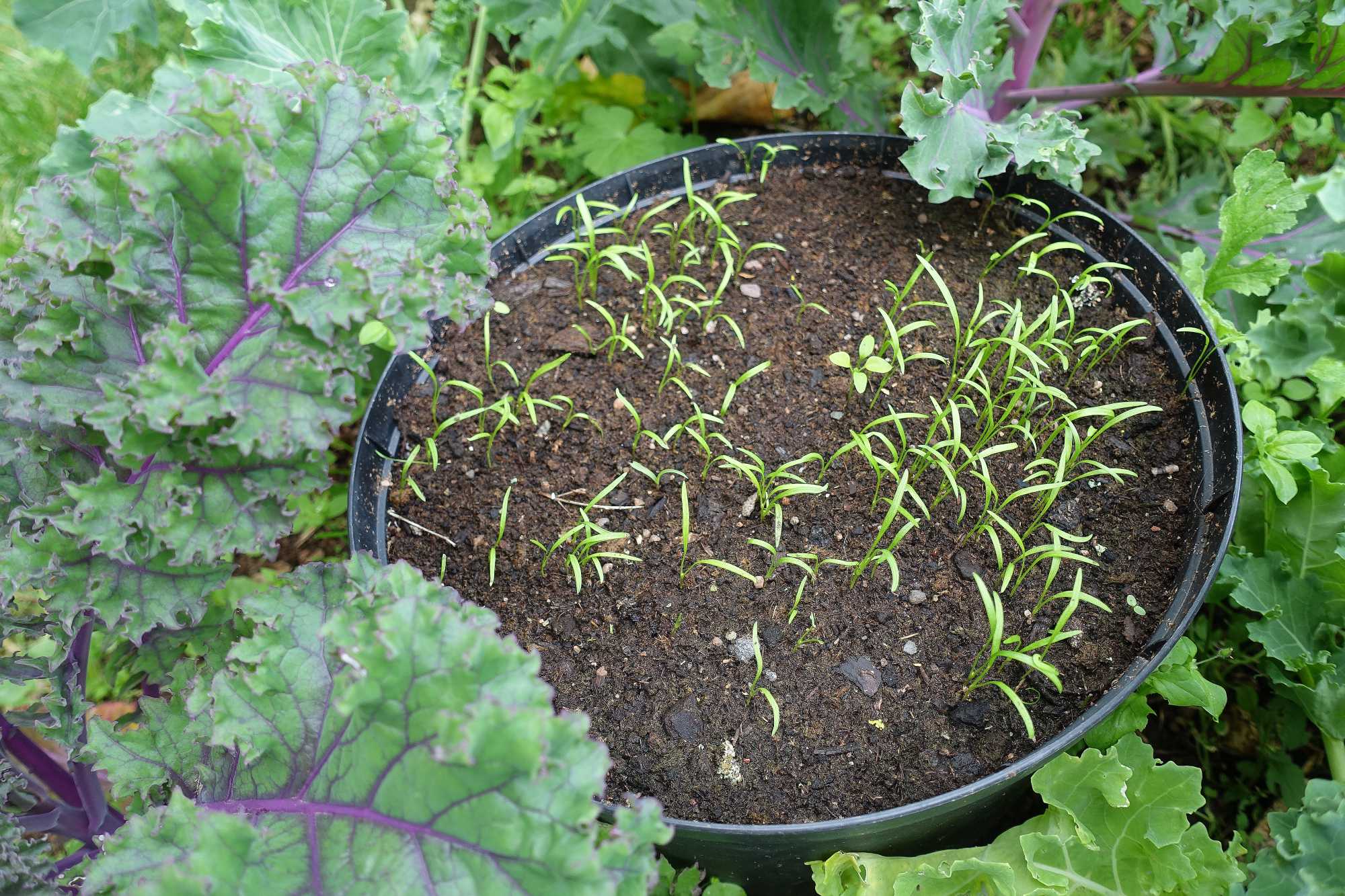 Den här krukan fick stå och gro i kållandet på norrsidan, där det inte är full sol som torkar ut sådden.
