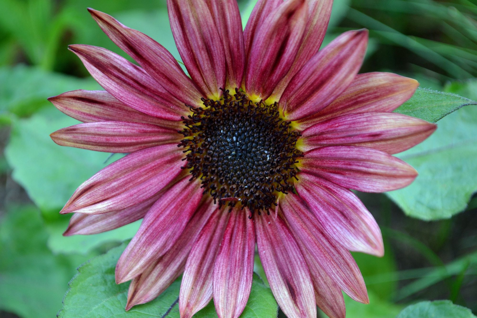 Solros finns i olika nyanser. Det här är en låg solros i rosa som heter 'Suntastic Bicolor Rose and Yellow'