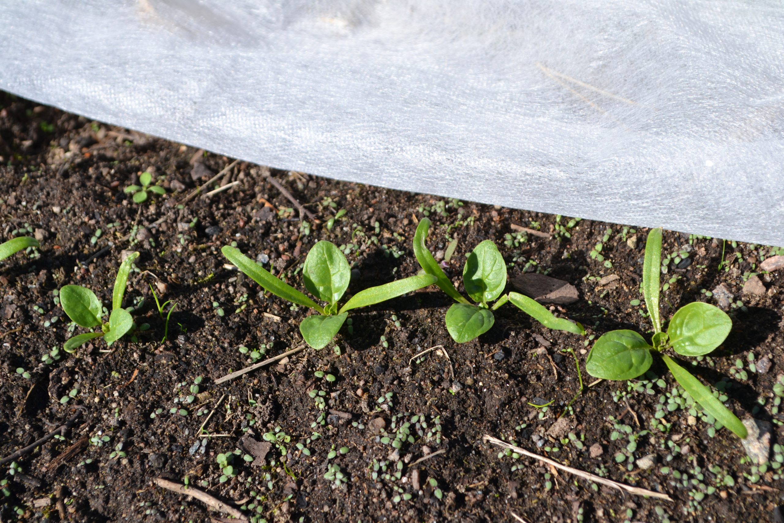 De små spenatplantorna på rad under fiberduken gör det lätt att urskilja ätbart från ogräs.