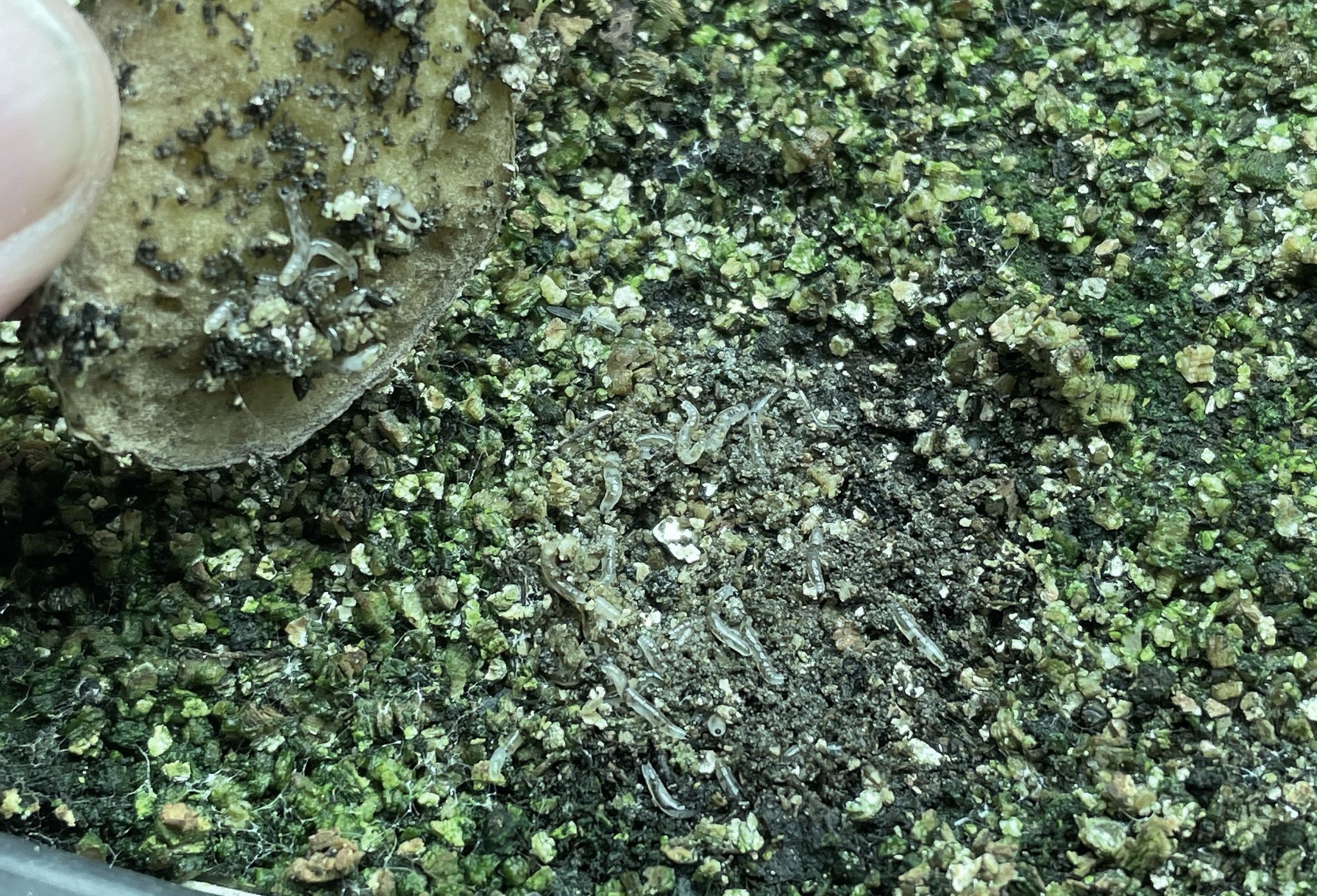 Det är svårt att se, men om du zoomar in kanske du lyckas. På jorden ligger mängder med genomskinliga små larver och i vänstra hörnet syns potatisen som jag försiktigt lyfter på. Larverna har sökt sig till potatisen för att äta.