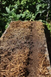 I den här bädden har jag gjort två fåror i täckmaterialet, fyllt med jord och sedan sått salladskål och pak choi för höstskörd.