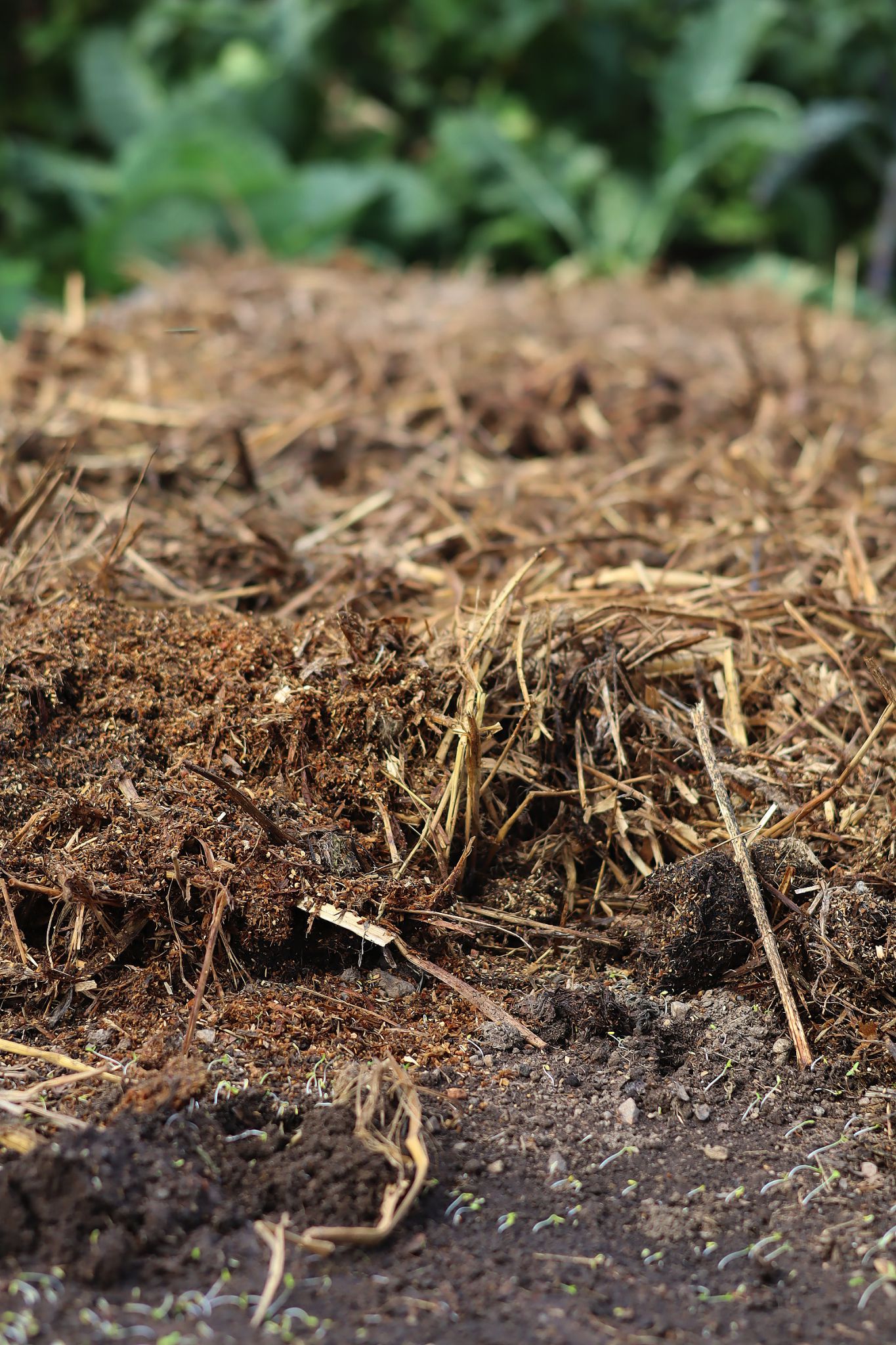 Täckmaterial läggs på i minst 10 cm tjocka lager. Exakt vad jag täcker med spelar mindre roll, bara jorden täcks och inte ligger bar.
