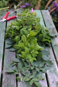Fler kvistar och blad sätts i för att markera formen och gömma stickmassan.