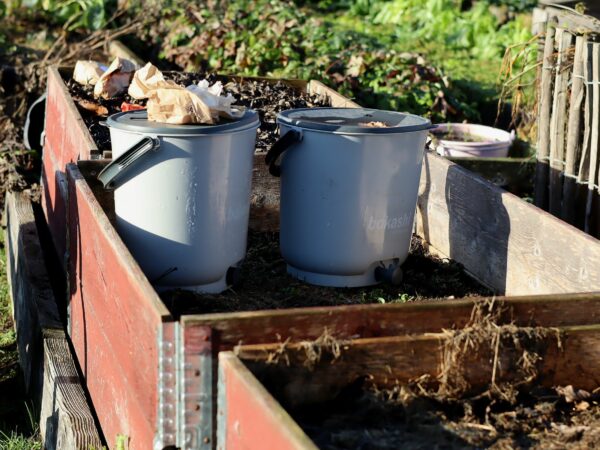 Ett hål i jorden fylls med hälften bokashi och hälften gammalt växtmaterial. Växterna komposteras snabbt i närheten av bokashi.