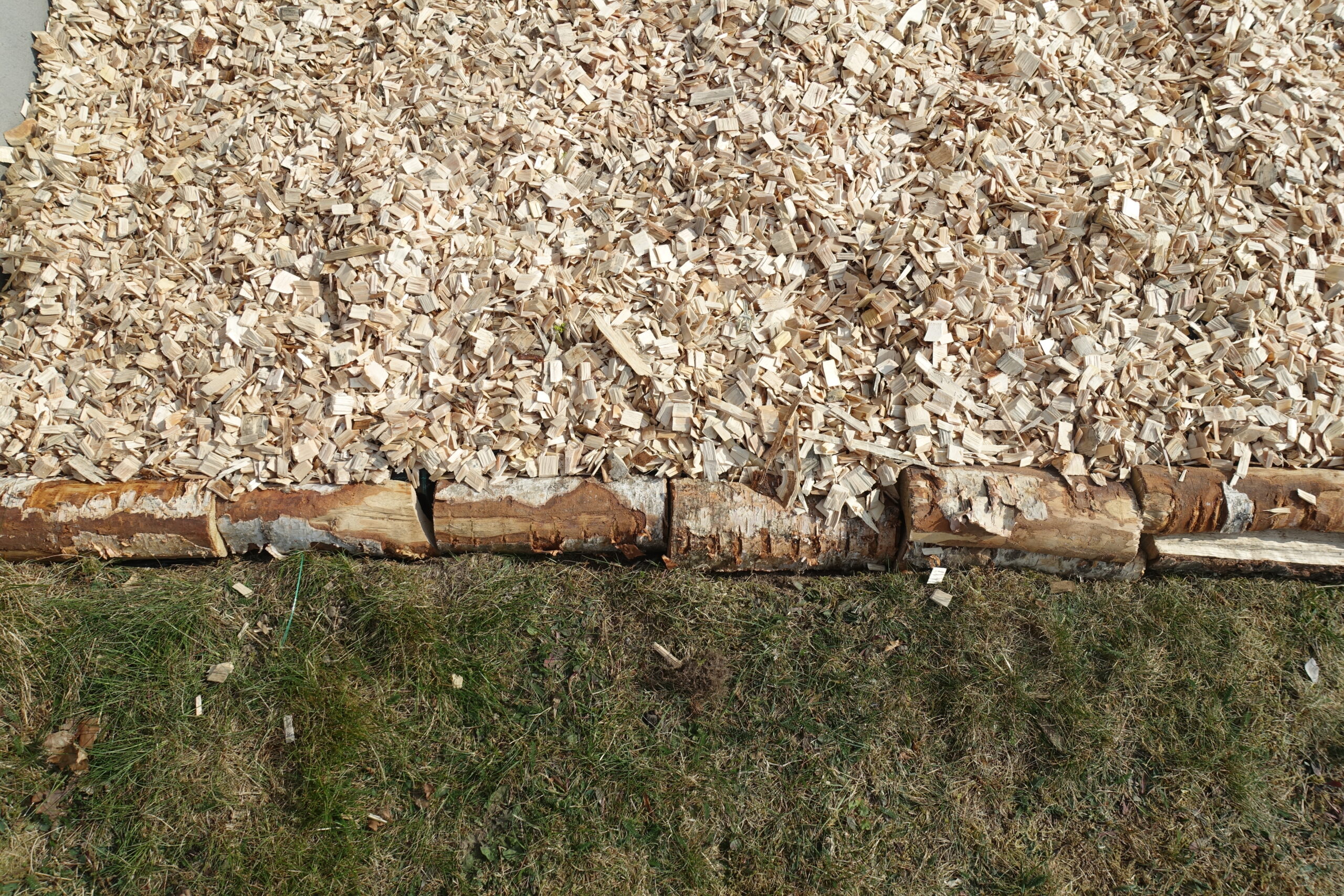 Så här har jag gjort en provisorisk övergång mellan träflis och gräsmatta/gång av gräs.
