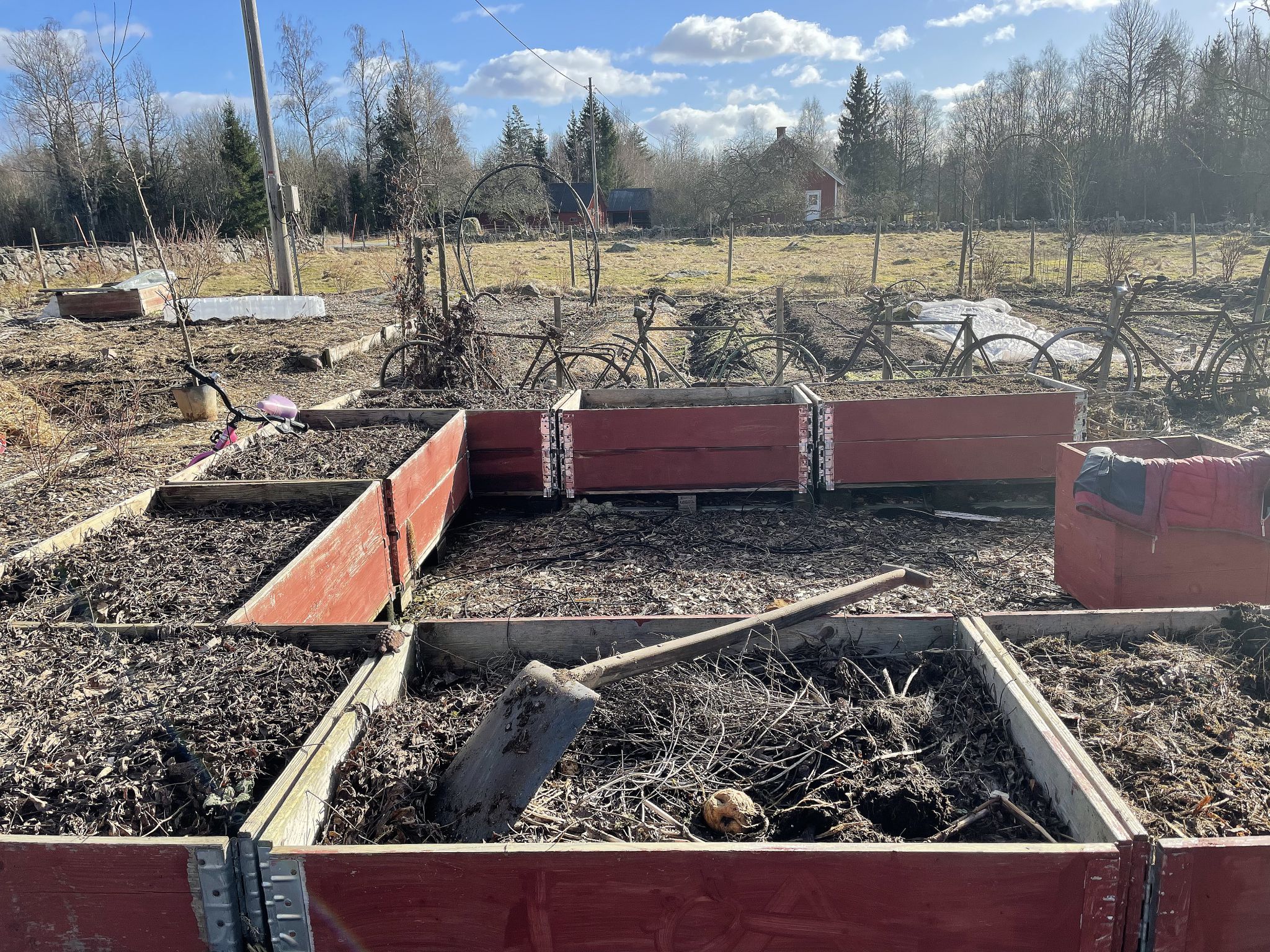 Så här ser min pallkrageodling ut efter vinterns snösmältning. Rufsigt och tufsigt och några lådor har jag börjat förbereda för vårsådd och plantering.
