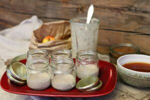 Den färdiga surdegsgrunden kan frysas i burkar.