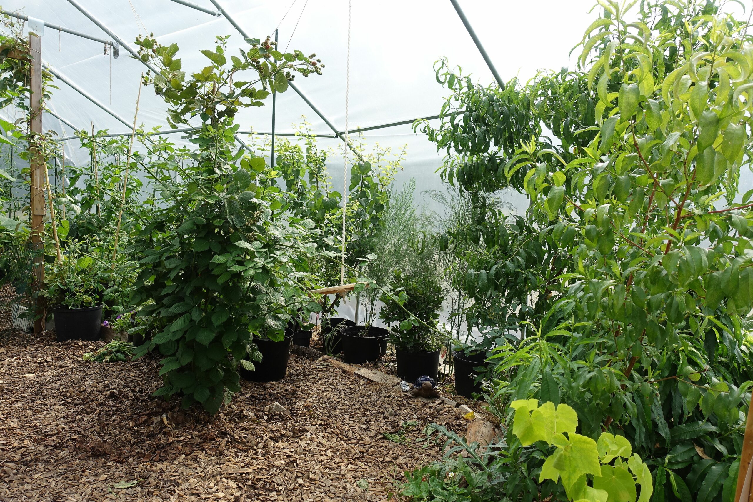 Så här växer persikoträd och andra träd i tunnelväxthuset - längs långsidorna. En utmaning att beskära nu inför säsongen, men jag hoppas eventuella fel går att åtgärda senare.