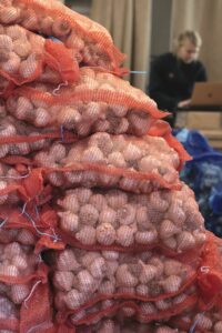 En bild från vårt packrum där vi packar och skickar alla beställningar med sättvitlök. På bild syns 400 kilo sättvitlök av sorten 'Cledor', som jag håller på att packa och märka.