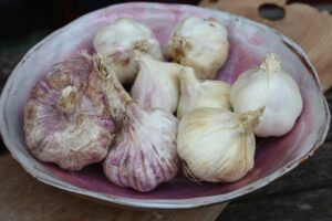 Vitlök på ett vackert fat - kan det bli finare! Det här är utsädeslök ur årets sortiment i min webbutik.
