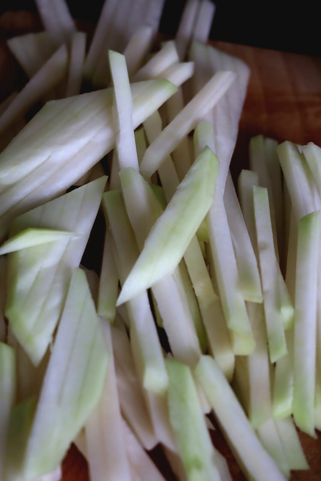 Stora stavar av kålrabbi kan användas till pommes - jättegott! De skärs för hand med kniv eller i en kraftig mandolin.