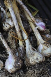 Färsk torkad vitlök som inte putsats har blast och rötter kvar. Och en del jord.