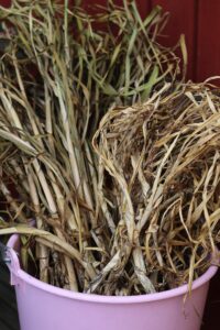 25. augusti 2025Den här vitlöken har legat i skugga i ett svalt växthus och torkat. Nu är det dags att putsa den.