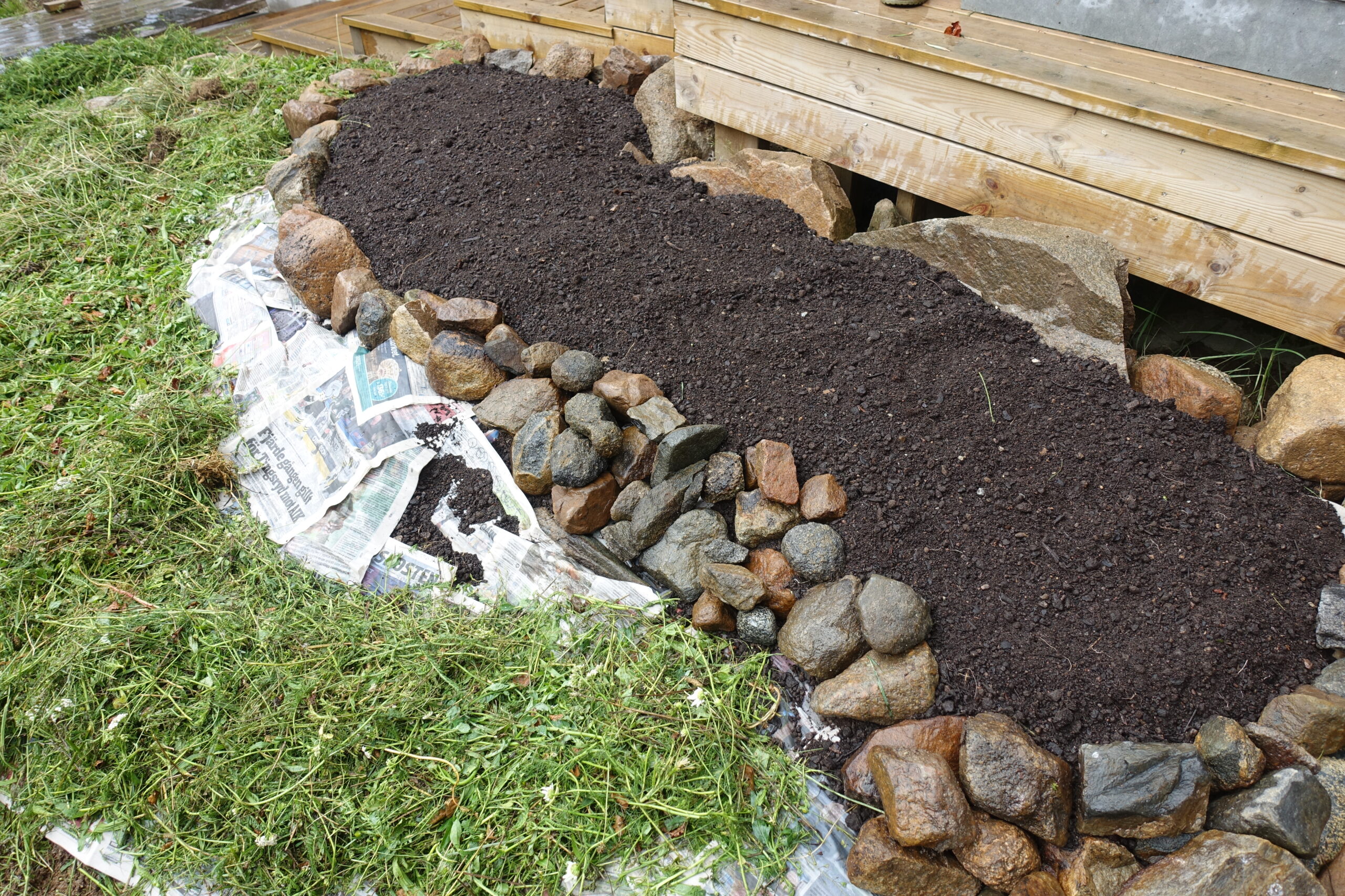 Titta! Efter en kort stunds arbete har vi gjort enkla terrasseringar med stenar. Marken är täckt med tidningar och klipp från trädgården. Den övre delen är täckt med tidningar och matjord och där sår nu Eva snabbväxande bladgrönsaker för höstskörd.