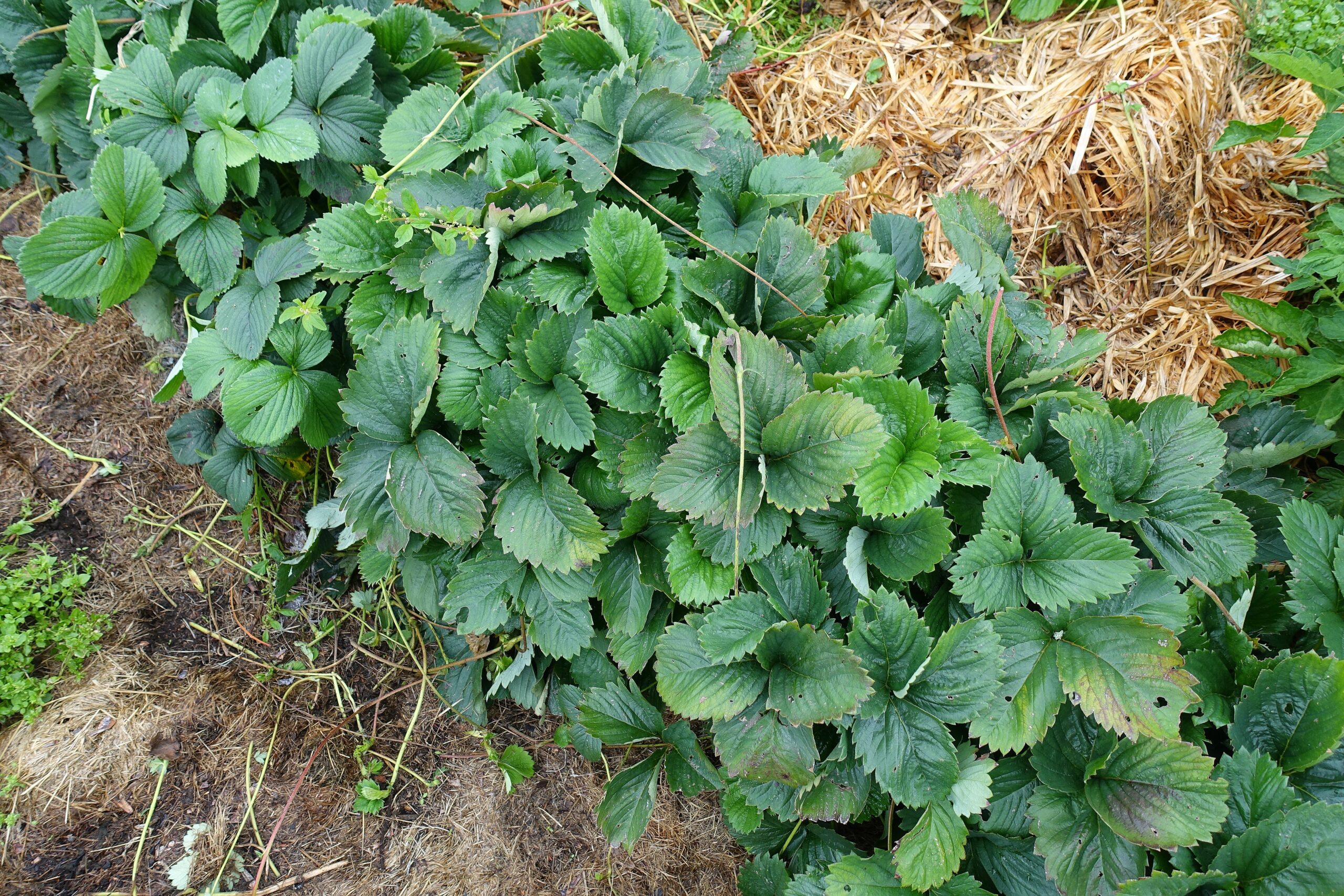 Några få jordgubbsplantor ger otroligt många nya revor. Den här raden ska jag gräva bort under hösten, då plantorna har blivit för gamla för att ge bra skörd.