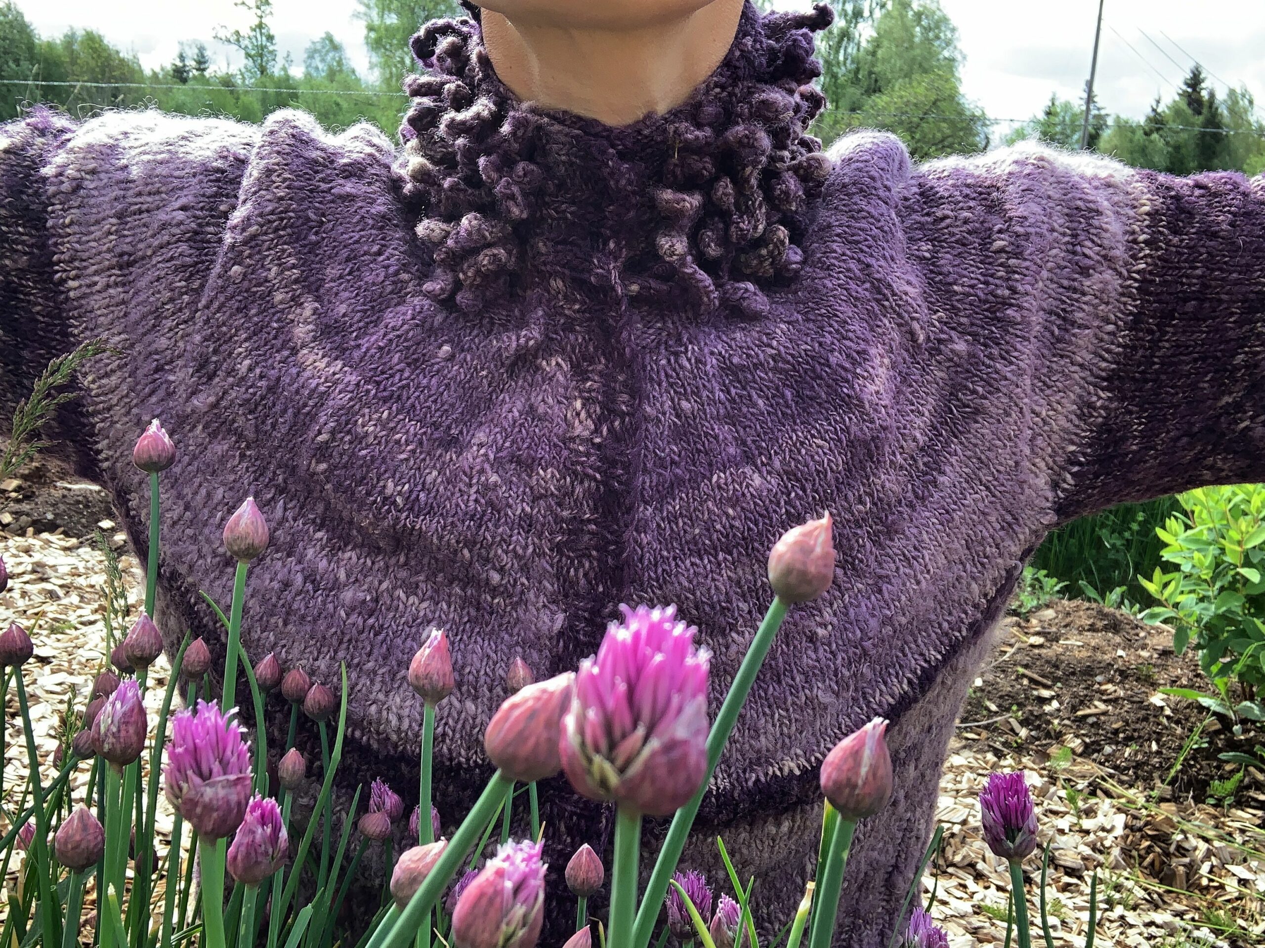 Den lila koftan är färdig just som de vackra gräslöksblommorna slår ut i trädgården. Vilken kombo!