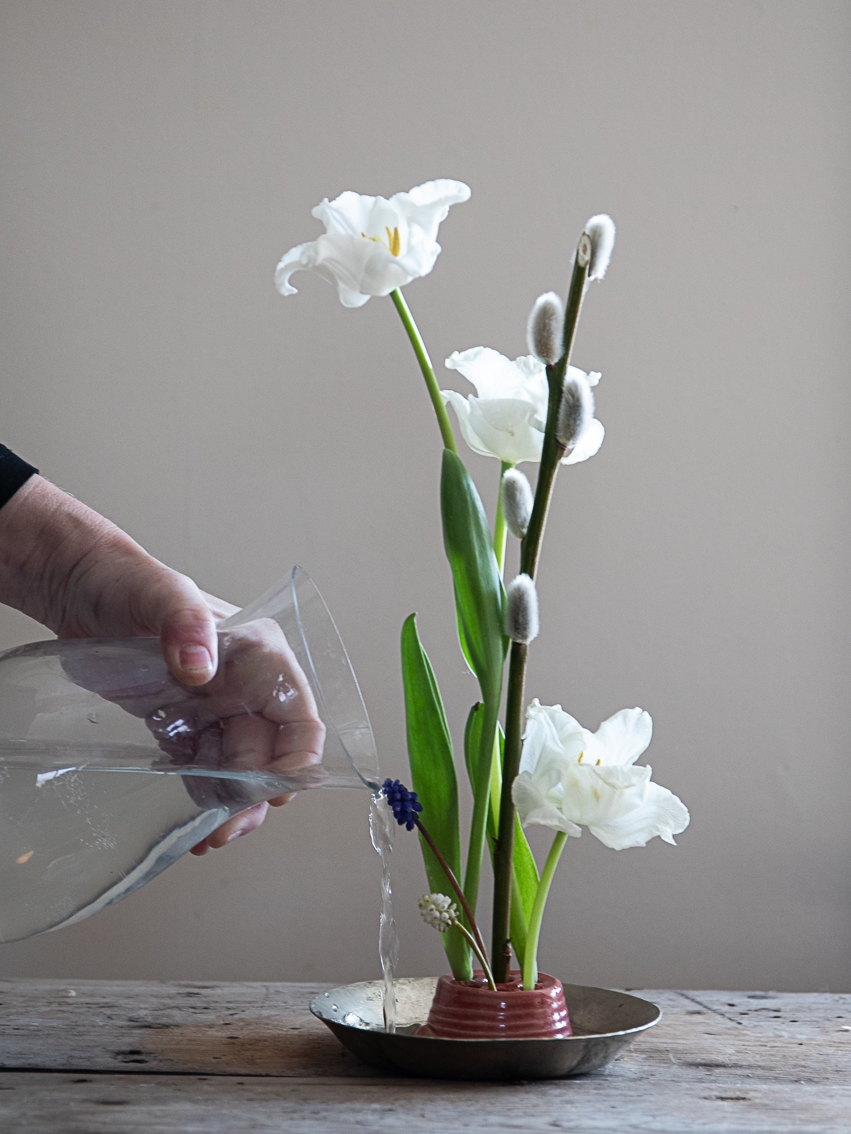 Blomhållaren behöver stå på ett fat eller i en skål eller vas med lite högre kant. Stjälkarna behöver vatten för att hålla sig fina. Foto: Maria Fors Östberg
