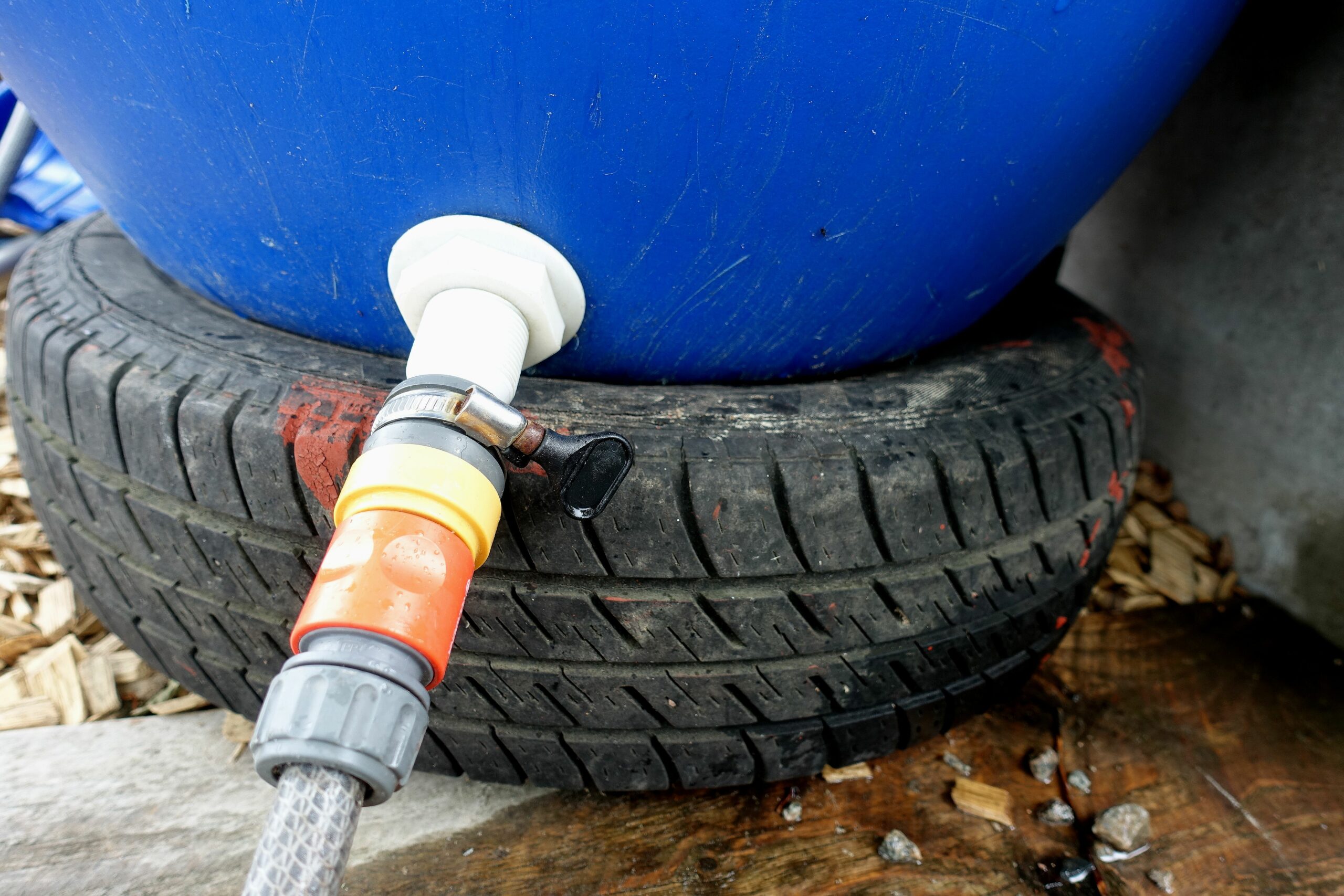 I en av tunnorna vid huset sitter en koppling i botten, som leder vattnet vidare till växthuset genom vattnets eget tryck.