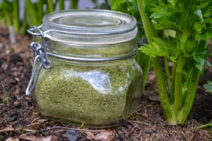 En burk med sellerisalt, gjord på selleri som odlats i trädgården.