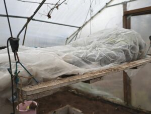Det ser ut som om jag hissat upp en insvept död kropp på en bår - men det är bara mina växter under en fiberduk.