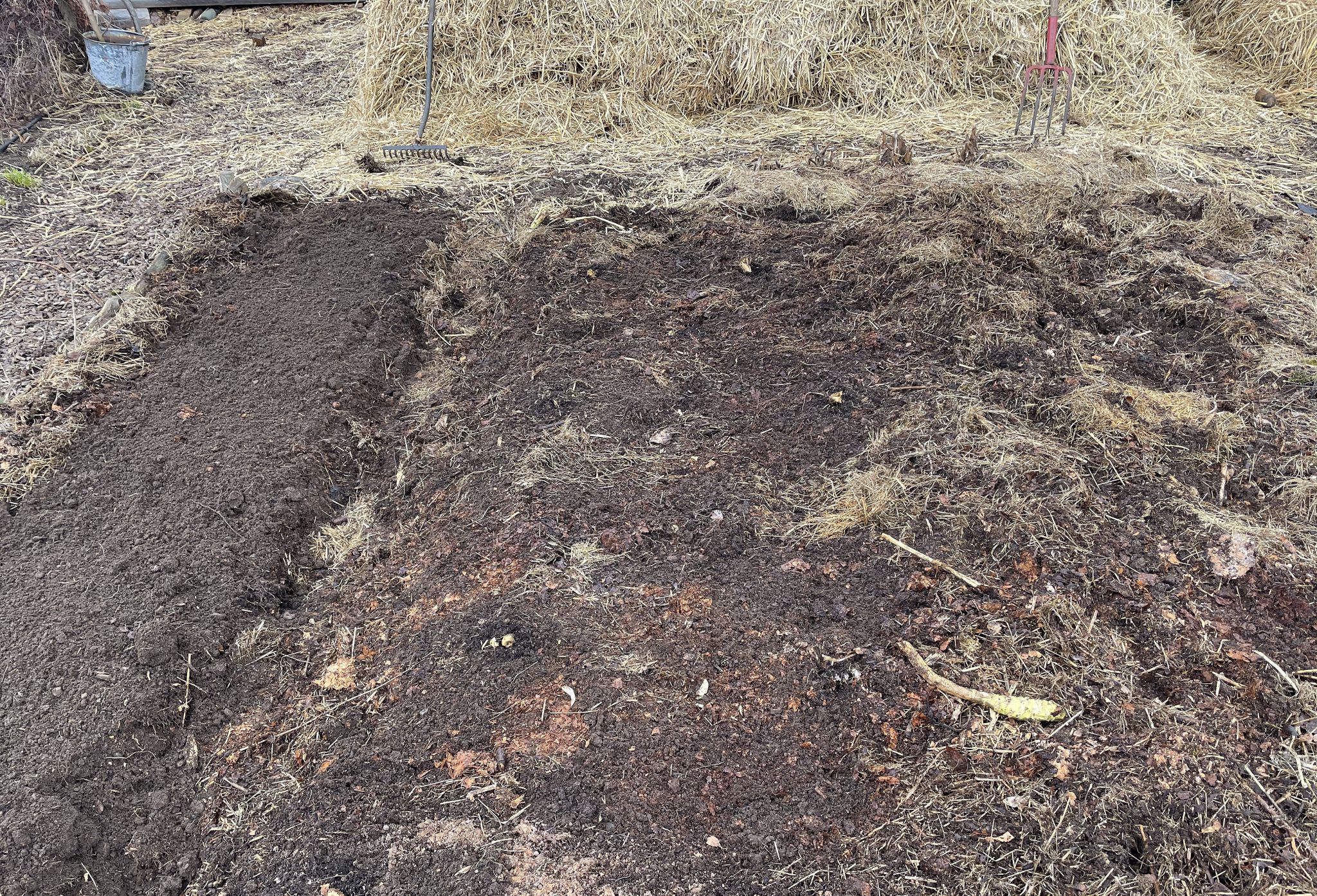 Här har jag börjat gräva upp jord från gång vid bädd till vänster. Övrig yta är inte påbörjad.