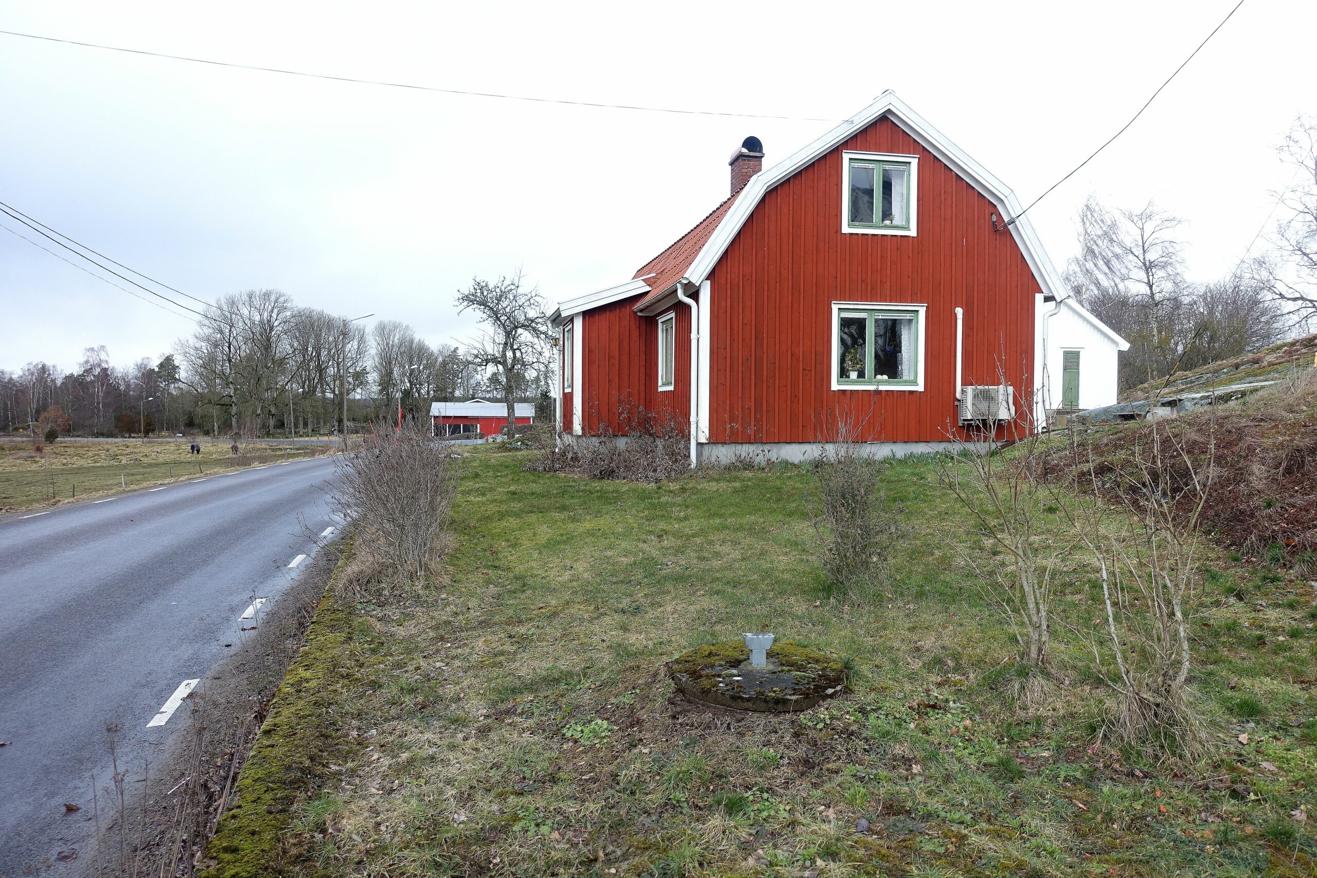 En skruttig gräsmatta framför en röd liten stuga.