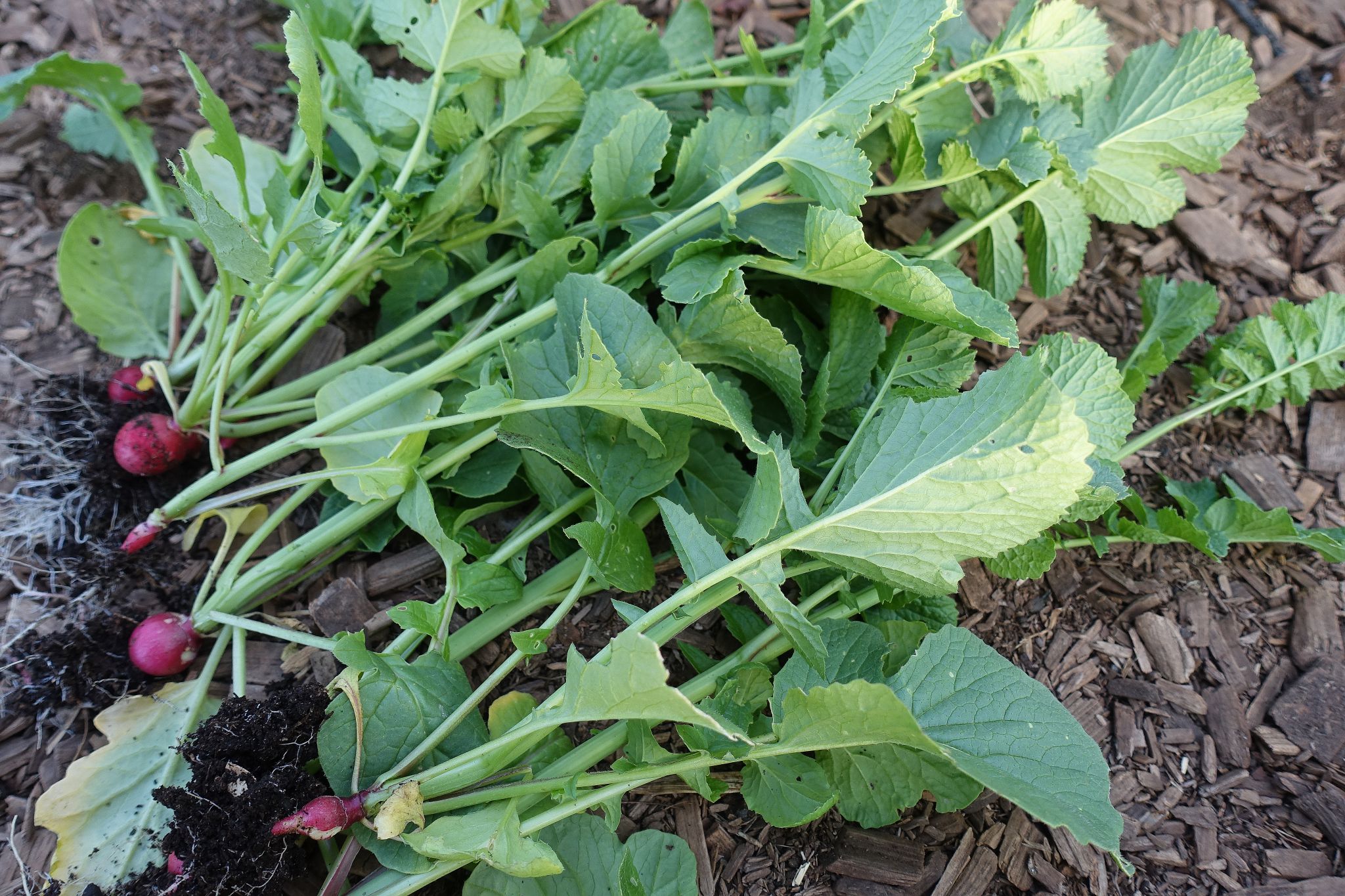 Om du inte odlat rädisor förut med lyckat resultat är det svårt att veta vad som är bra och inte. Den här sorten heter 'Burro Gigante' och bildar rädisor stora som plommon. Nu har de stått still i växten länge utan att bli större, bara blasten har vuxit.