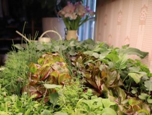 Blandade växter kan odlas inomhus under växtbelysning och ge stor skörd. Här trängs växter till skörd och utplantering i olika projekt.