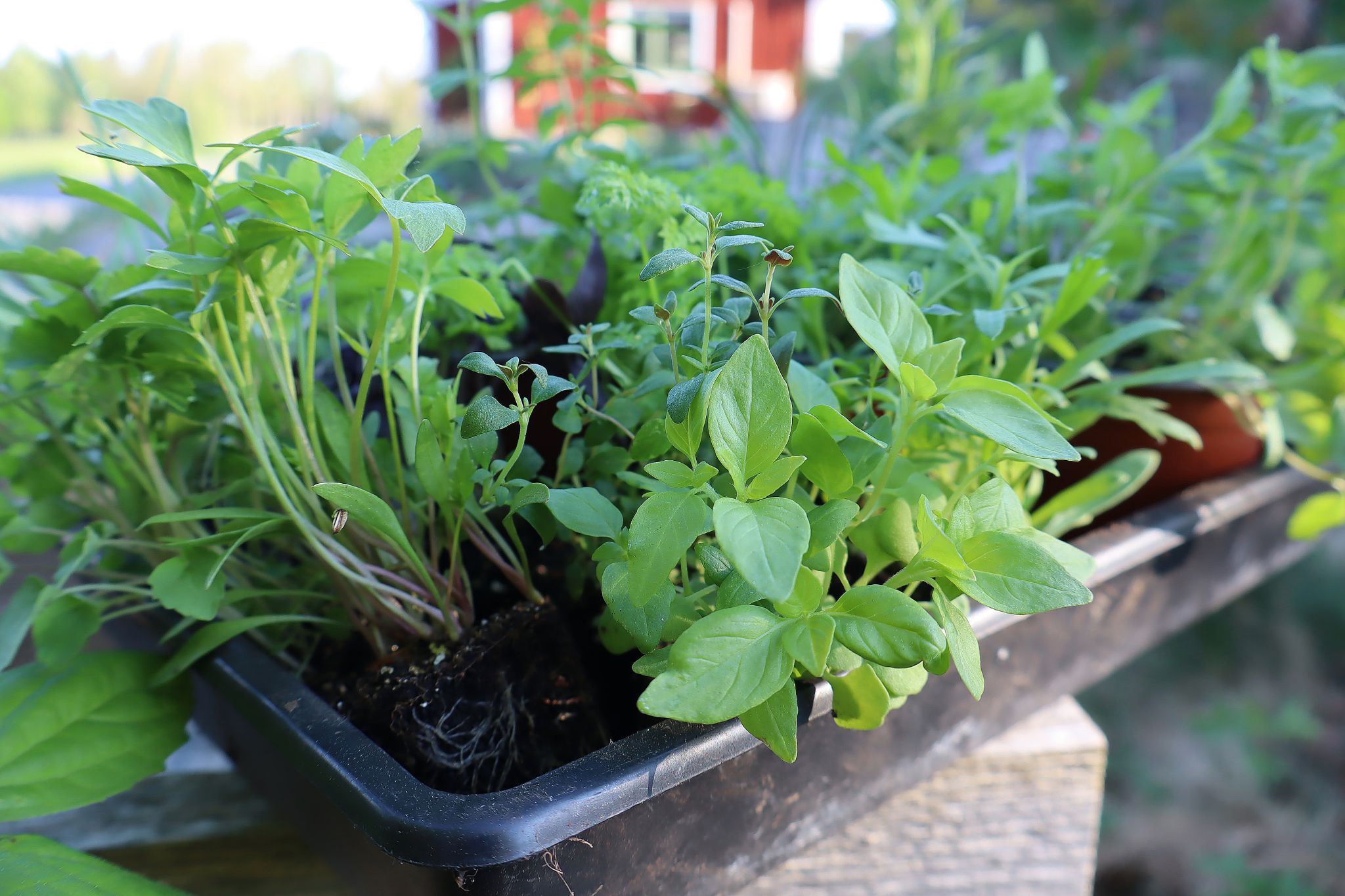 Kryddorna jag valt till min pallkrage har vattnats ordentligt innan plantering, eftersom det varit så väldigt varmt och torrt i maj 2024.
