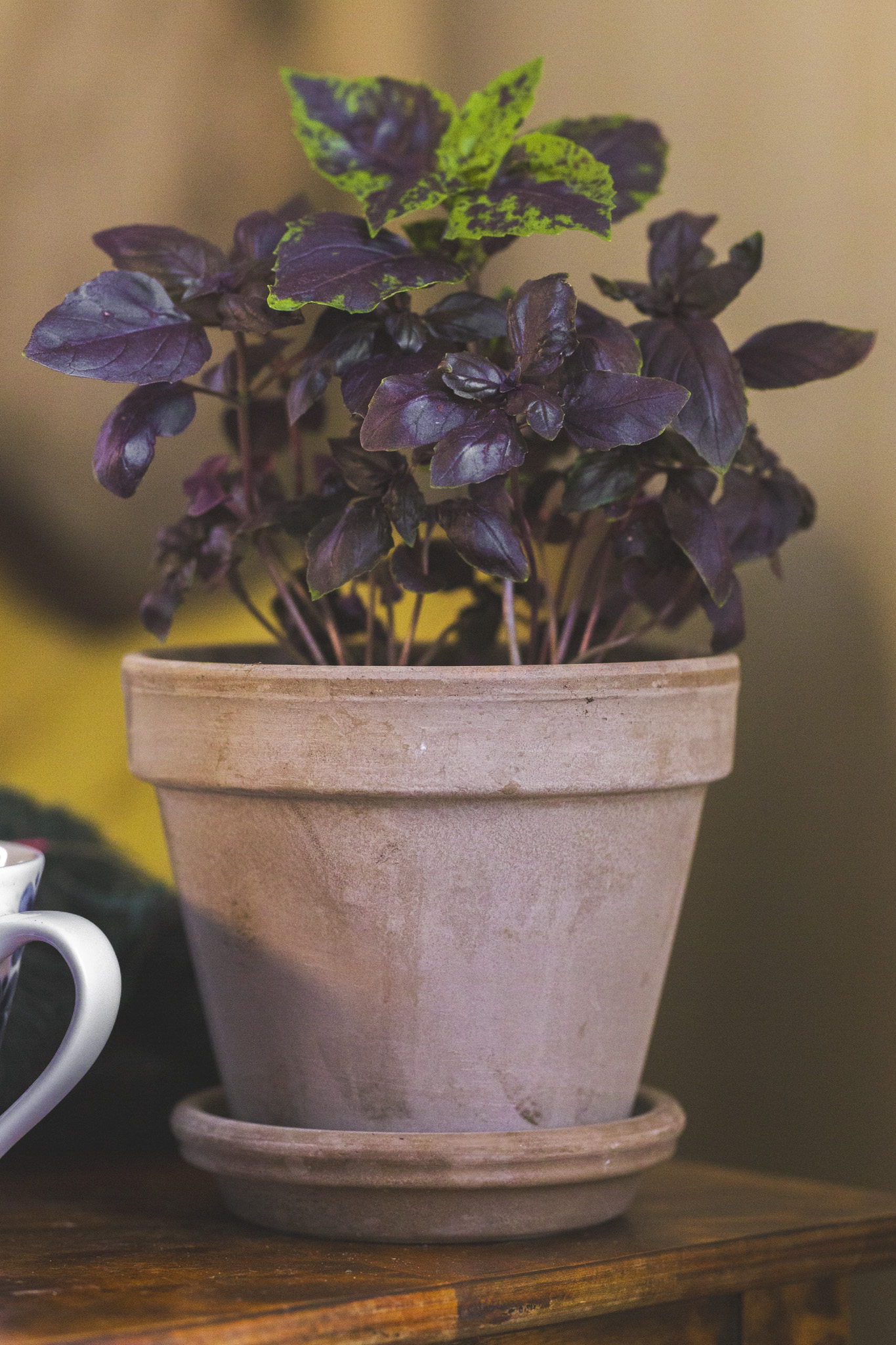 En rödbladig basilika är vacker att odla i kruka. Skotten i toppen nyps av vid skörd och då grenar sig växten och ger ny tillväxt.