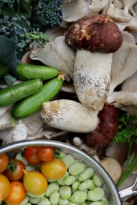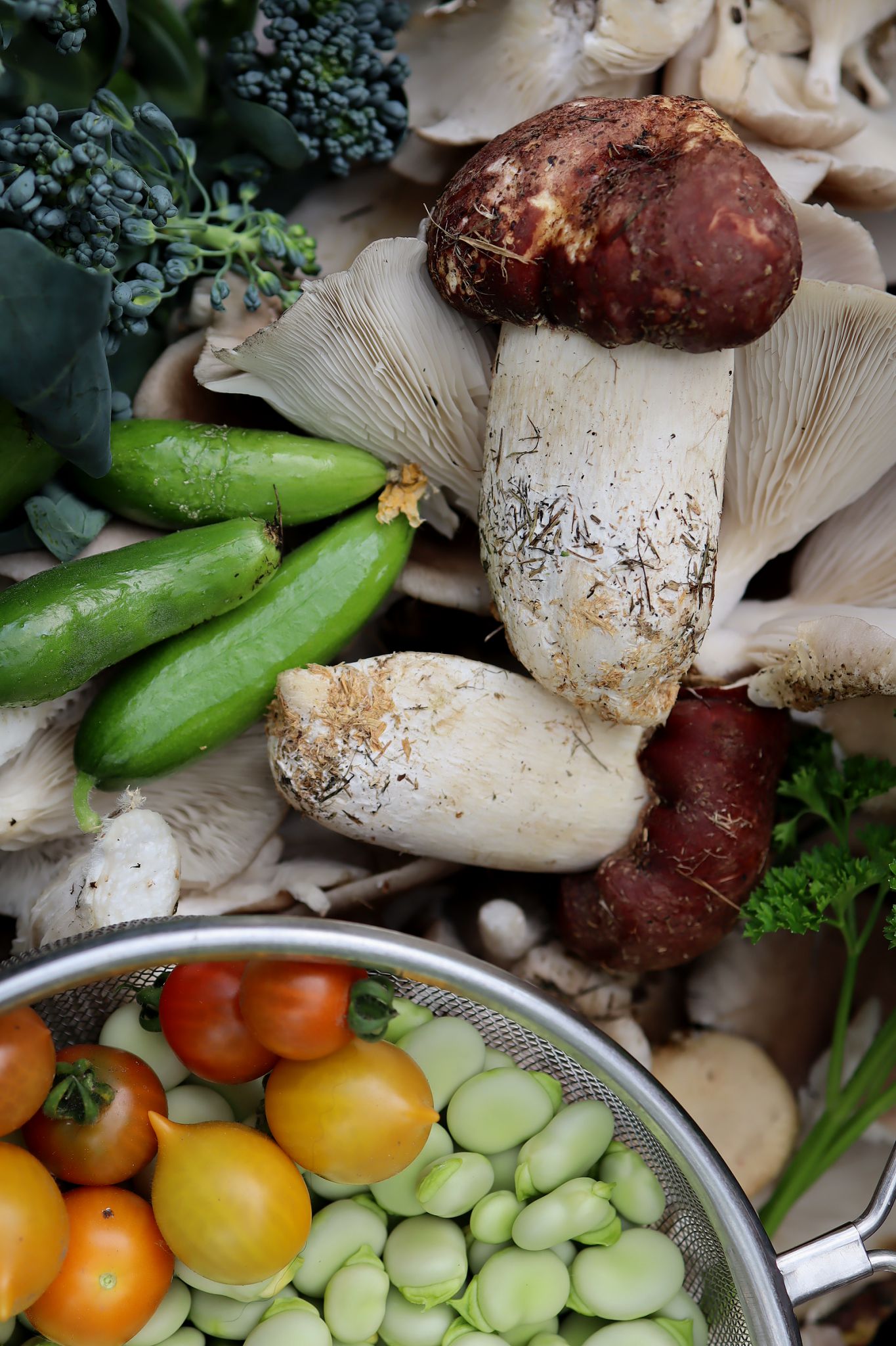Min första skörd av jättekragskivling gav mersmak. Här tillsammans med grönsaker från trädgården och två kilo ostronskivling från en odling intill.