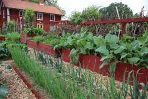 De röda odlingslådorna i bakkant av odlingen är gjorda ovanpå lastpallar. Det gör att jorden i lådorna inte har kontakt med marken under och därför växer inga trädrötter upp i lådan och störa grönsakerna jag odlar.