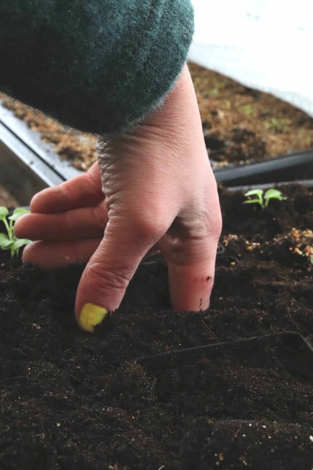 Planteringen är enkel. Jag fyller jord i krukorna, petar hål med fingret och pluppar ner pluggplantan.