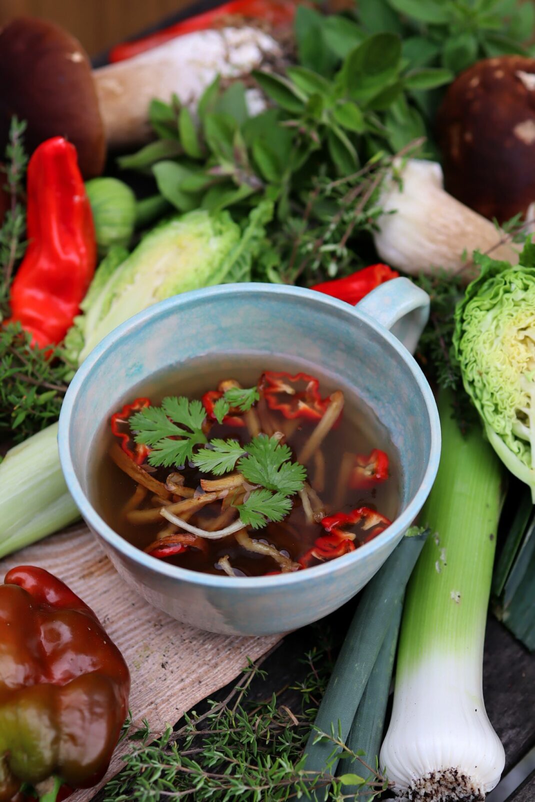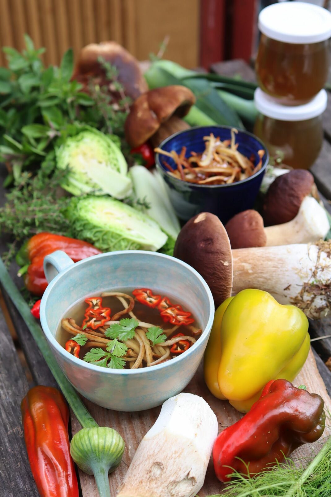 Buljongen kan användas som grund i all typ av matlagning där du vill använda buljong eller fond. Den är också synnerligen god att värma i en mugg och dricka till förrätt eller lunch. Lägg gärna i färskt grönt, stekt svamp eller krutonger vid servering. På bilden har jag gjort en enkel soppa med fint strimlad friterad svamp, fint strimlad paprika och koriander i.