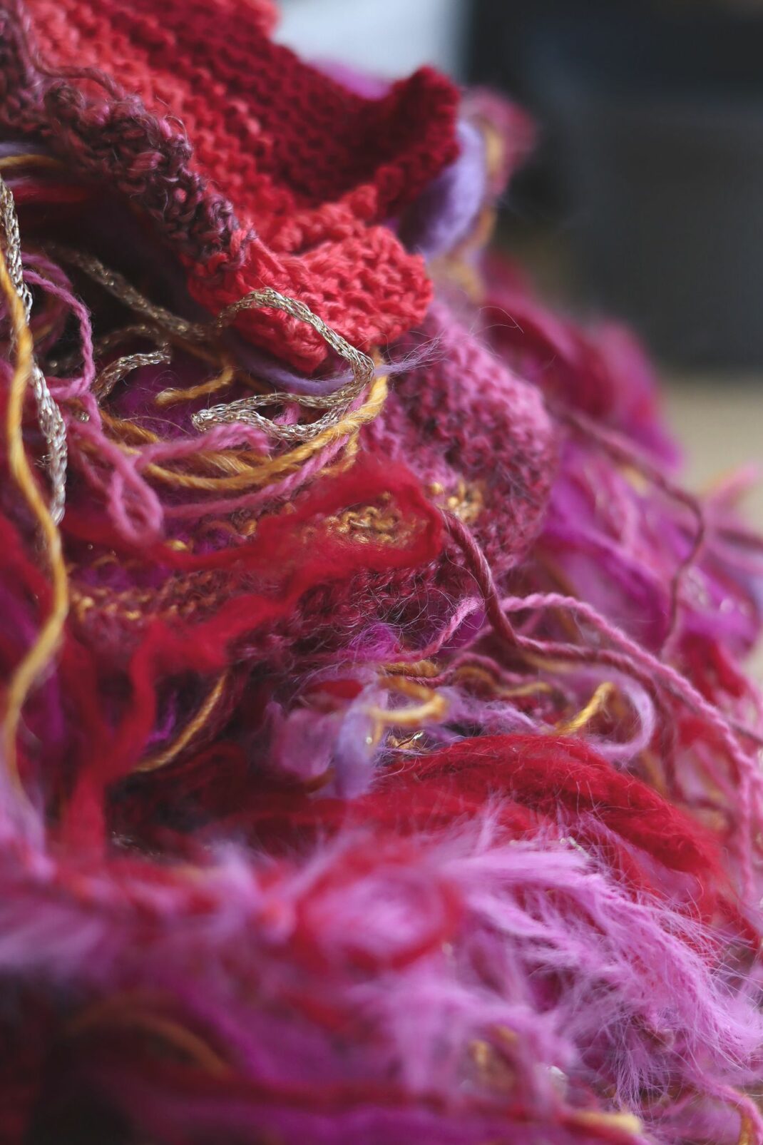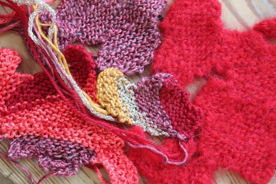 Förra hösten bestämde jag mig för att göra en tröja i freeform-tekniken. Jag samlade ihop en drös garner i färger jag gillar och som ser fina ut tillsammans; mestadels rosa och röda toner, med en vacker gul linblandning och ett guldigt effektgarn som kontrast. Mestadels är detta restgarner från en annan rosa tröja, tillsammans med några fynd från garnkorgar samt något nyinköpt nystan. En hel del mohair, några ullgarner, det helt bedårande Malabrigo Susurro (silke, lin, ull) och lite annat.