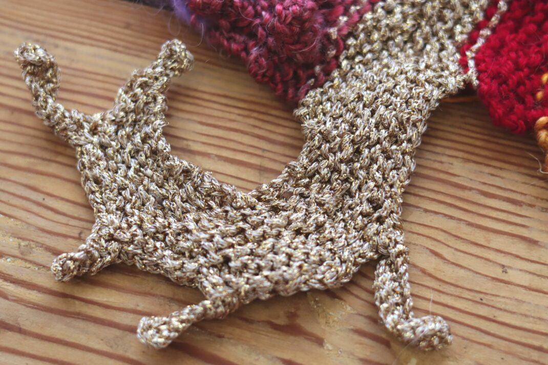 Delarna har stickats på tre olika sätt kan man säga, med en del variationer. Inga trådändar har fästs. Alla trådändar är längre än nödvändigt och kommer att användas som dekoration senare.