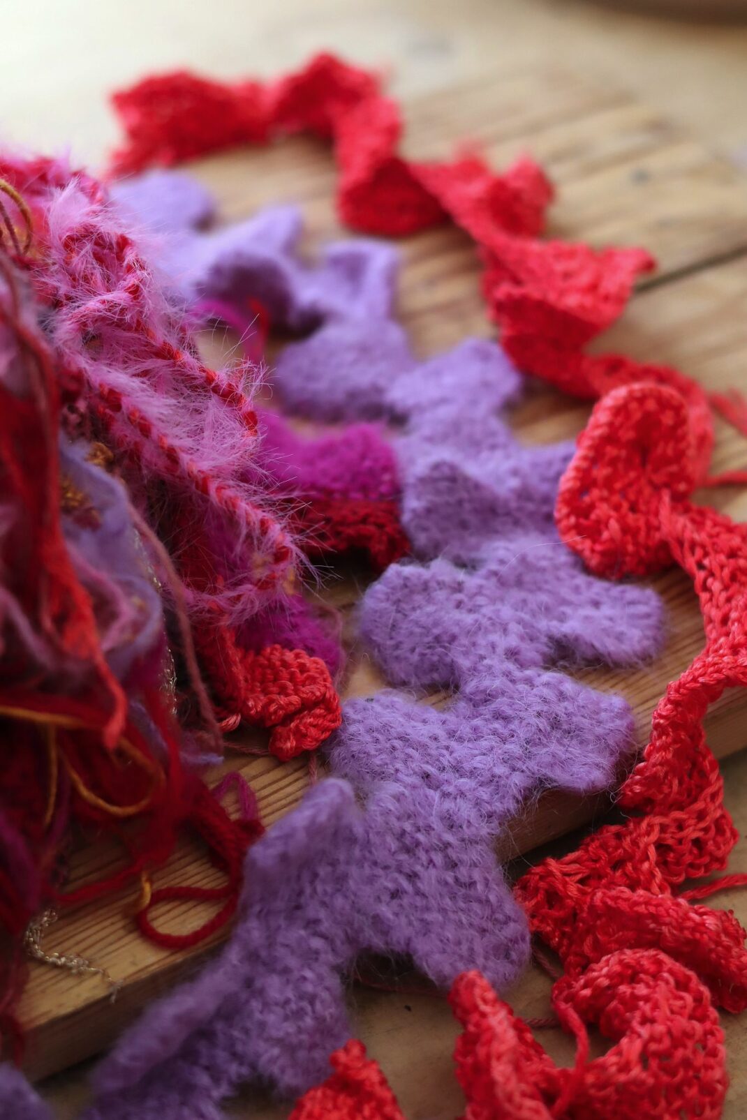 Dessutom har jag också stickat och virkat en del avvikande former, som snoddar, delar med små stroppar på, blommor och små stycken i mer tydliga former.