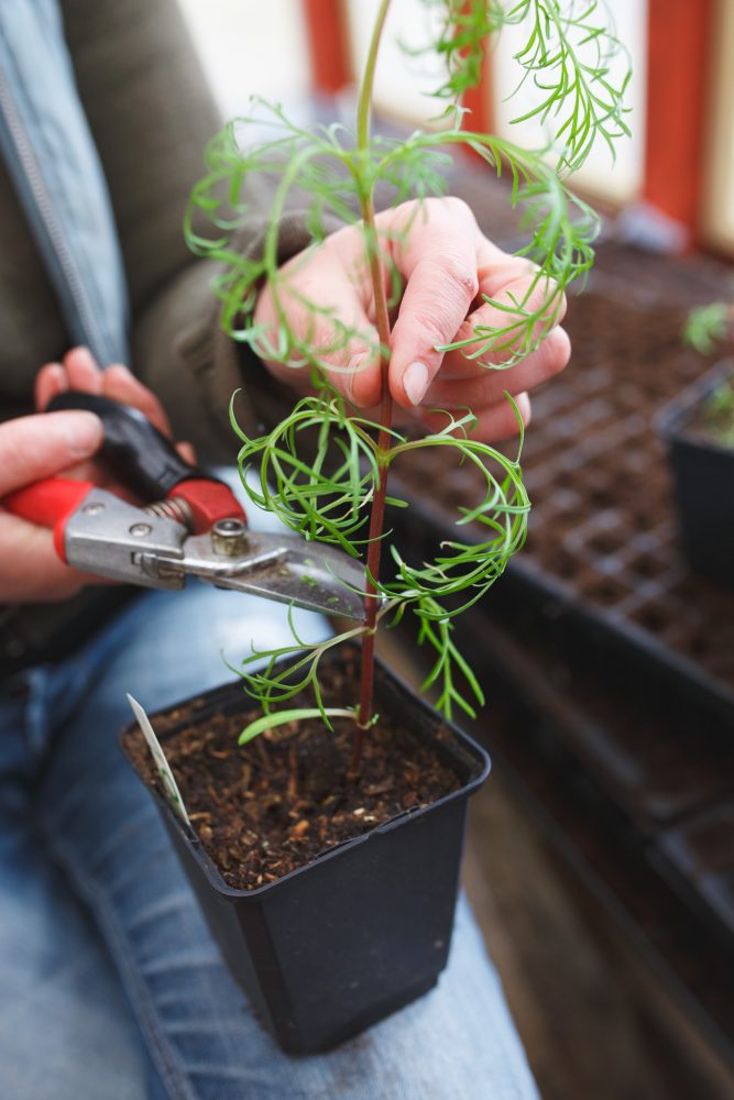 När växten fått till exempel två bladpar låter du den växa ytterligare centimeter. Därefter knipsar du av stjälken precis ovanför ett bladpar.