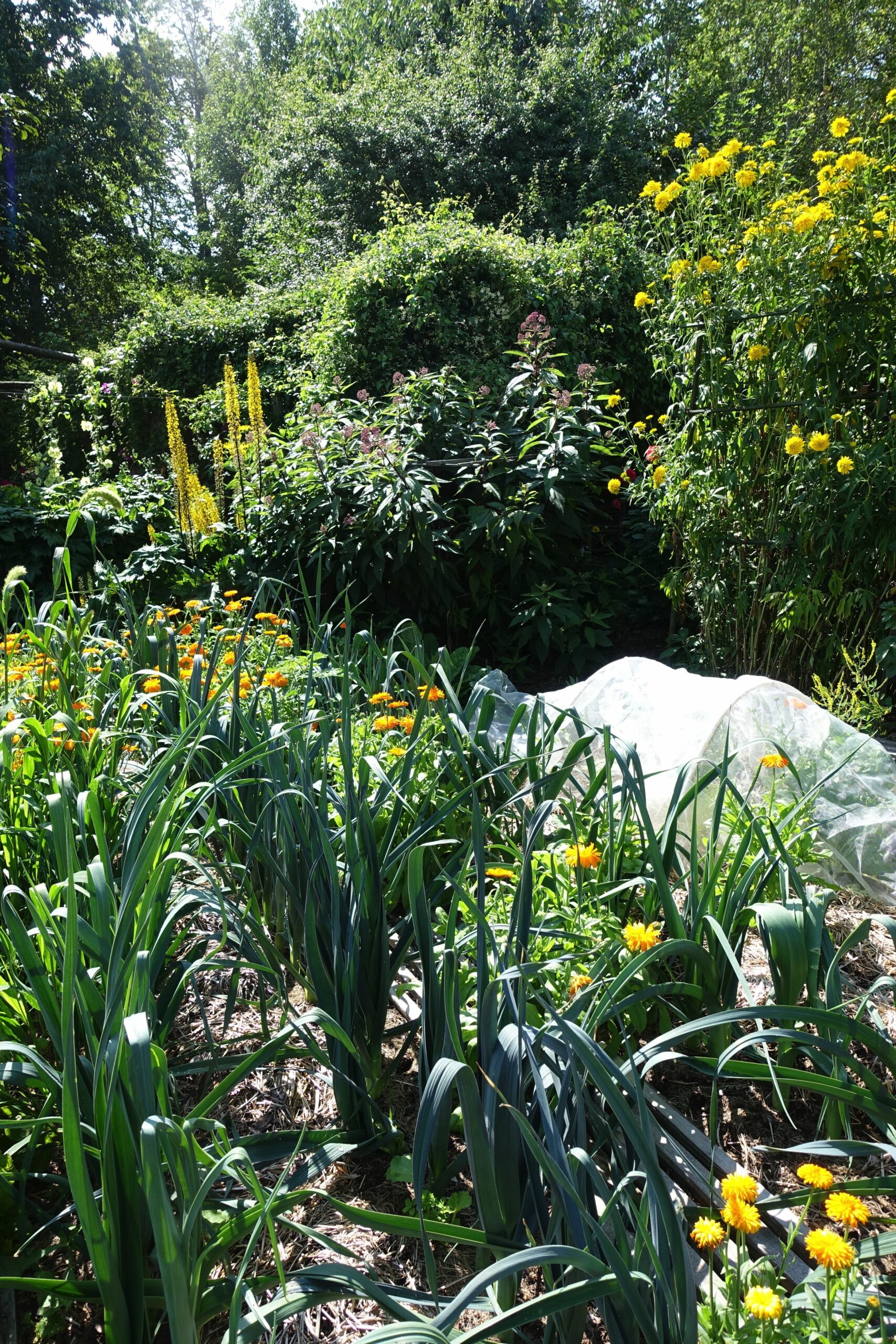 Här är land proppfulla med purjolök och rotsaker, tillsammans med sommarblommor. Allt täckodlat med bland annat halm och gräsklipp.